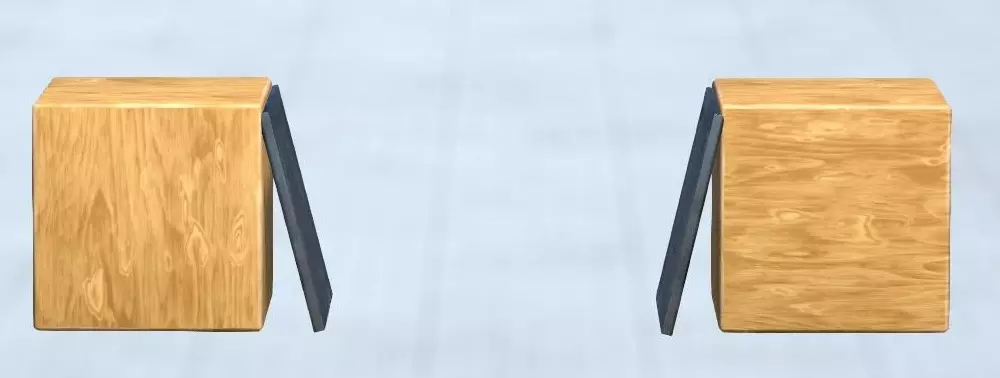 你可以通过点击相关联的物体并查看蓝色模型来查看已使用的关节。每个关节都有一个独特的符号。 添加碰撞箱 为了实现更多可能的构造,与关节相连的元素之间不会相互碰撞。否则,图片中的木板会立即被立方体阻挡。要让你的可移动元素在正确的时刻停止,你需要添加元素为你的部件创建碰撞箱。 要做到这一点,最好使用2型关节(固定关节)。 下面我将以活板门为例进行说明: