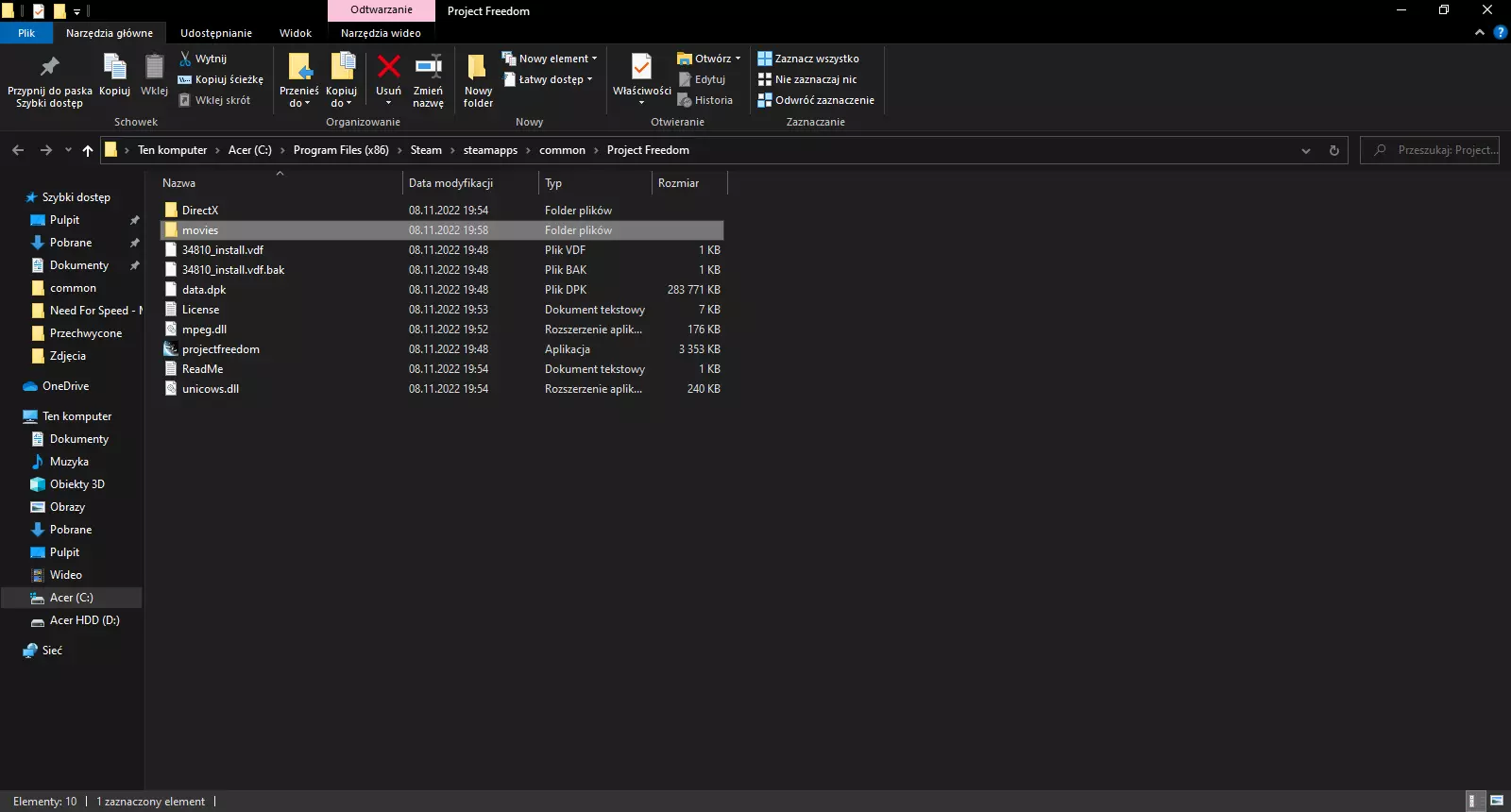 大家好! 所有购买了这款优秀游戏的玩家肯定都遇到了一个严重问题,那就是它无法在Windows 10和Windows 11系统上启动。因此,我决定寻找这个问题的解决方法,并与《Project Freedom》/《Starmageddon 2》的其他购买者分享。 1. 游戏文件操作 最基本且简单的方法是在Movies文件夹中设置视频文件,使其能被Windows Media Player读取,并在文件名末尾添加“.wmp”,具体可参考下方截图; 1.1. 进入文件夹: