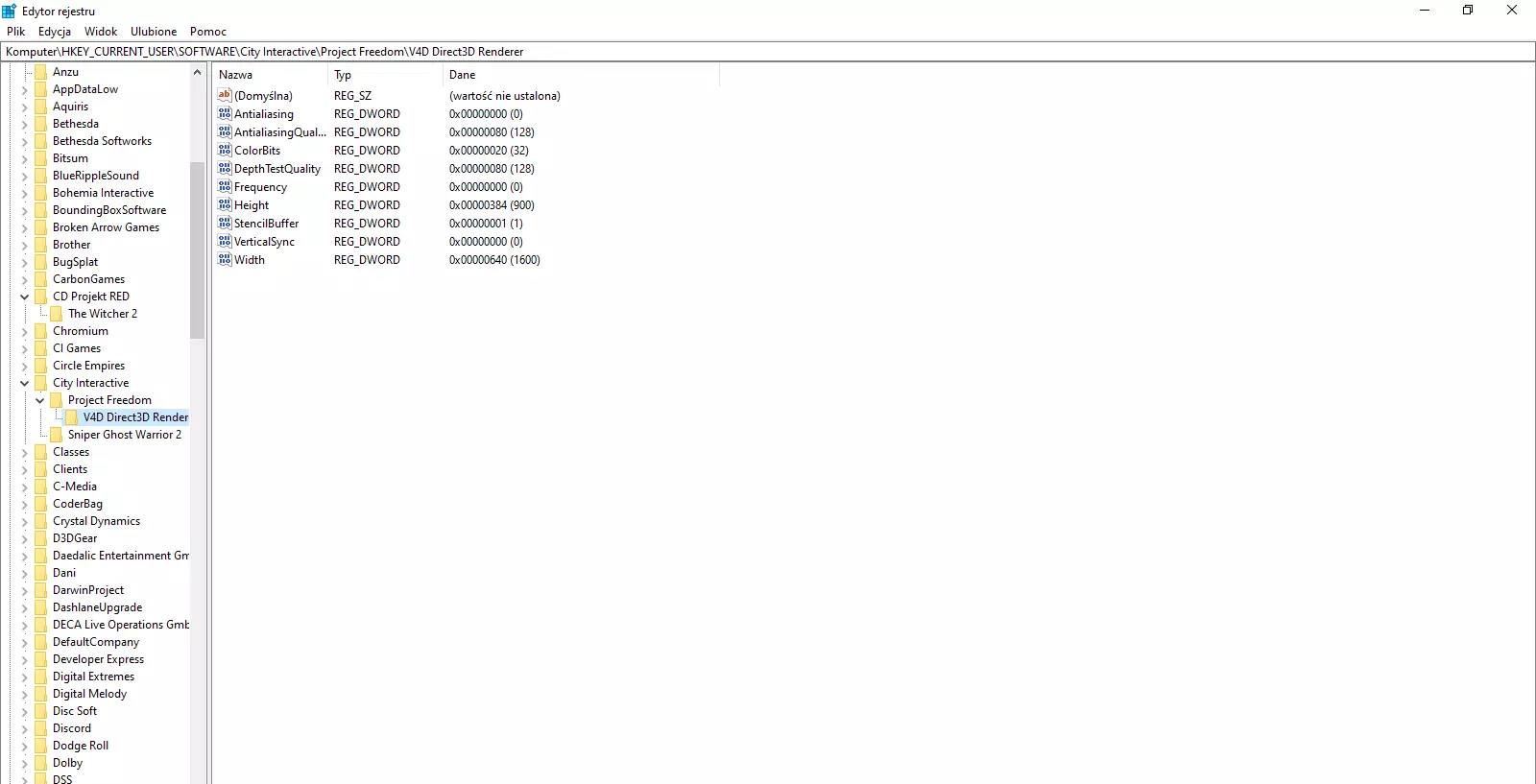 1.4.完成所有操作后,点击“应用”并启动游戏。 2.更改分辨率; 完成步骤1的操作后,分辨率可能会自动调整为显示器的比例,也可能不会。如果没有自动调整,由于游戏设置中支持的分辨率有限(例如找不到1920x1080px),需要通过以下方法解决: 2.1.打开“注册表编辑器”【风险自负】: 2.2.找到“City Interactive”文件夹并进入: 2.3.进入名为“V4D Direct3D Render”的文件: 2.4.找到“Height”(高度)和“Width”(宽度)两个数值: