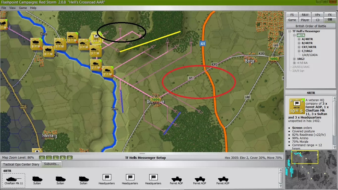 任务分析 1. 主要防御部队将由大部分步兵组成,包括2个连的兵力、大部分米兰反坦克导弹小组、迫击炮支援以及2个坦克中队作为后盾。步兵侦察排及其米兰机动小组将在南部提供警戒,以防敌人尝试侧翼包抄。 2. 我的钳形攻击部队将由剩余的2个坦克中队以及第3连步兵组成(他们将负责占领东北部城镇,为我军向南迂回提供侧翼保护)。 3. 至于炮兵,当他们投入战斗时,我将分别派遣1个炮兵连支援防御部队和钳形攻击部队,第3个炮兵连将被分配执行反炮兵任务或为关键区域提供火力支援。将计划付诸行动 在本节及接下来的几节中,我将介绍我的部署情况以及战斗的进展,并每小时更新一次(H+1、H+2等),同时我也会重点关注发生的关键行动。 钳形部队部署 在这里,我部署了4个RTR(配备2个坦克中队和1个步兵连)进入阻击阵地:A中队(黄线)占据北部山丘,B中队(蓝线)部署在树林和河岸沿线,C连则进入山丘后方的隐蔽阵地(黑圈),侦察排向前推进进行警戒。这样一来,如果有任何目标试图沿此路线移动,我就能形成一个理想的杀伤区(红圈)。