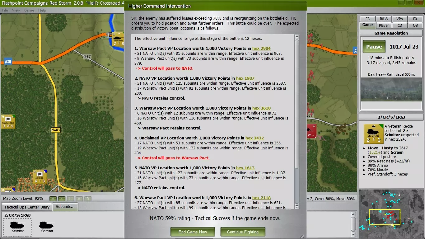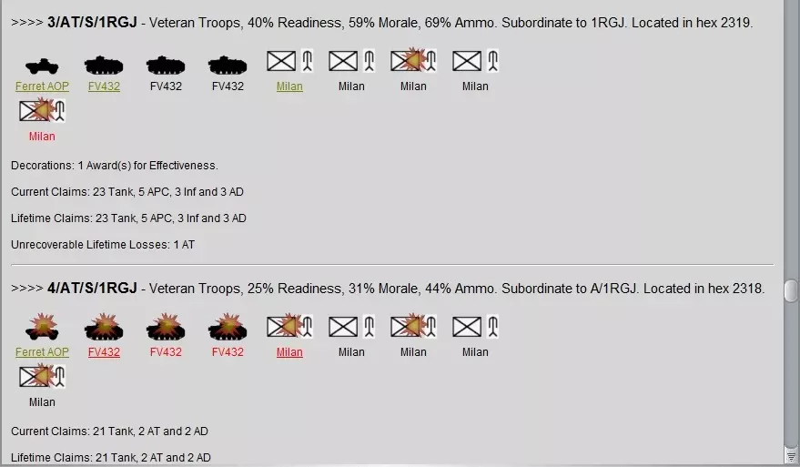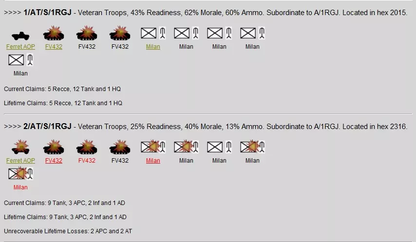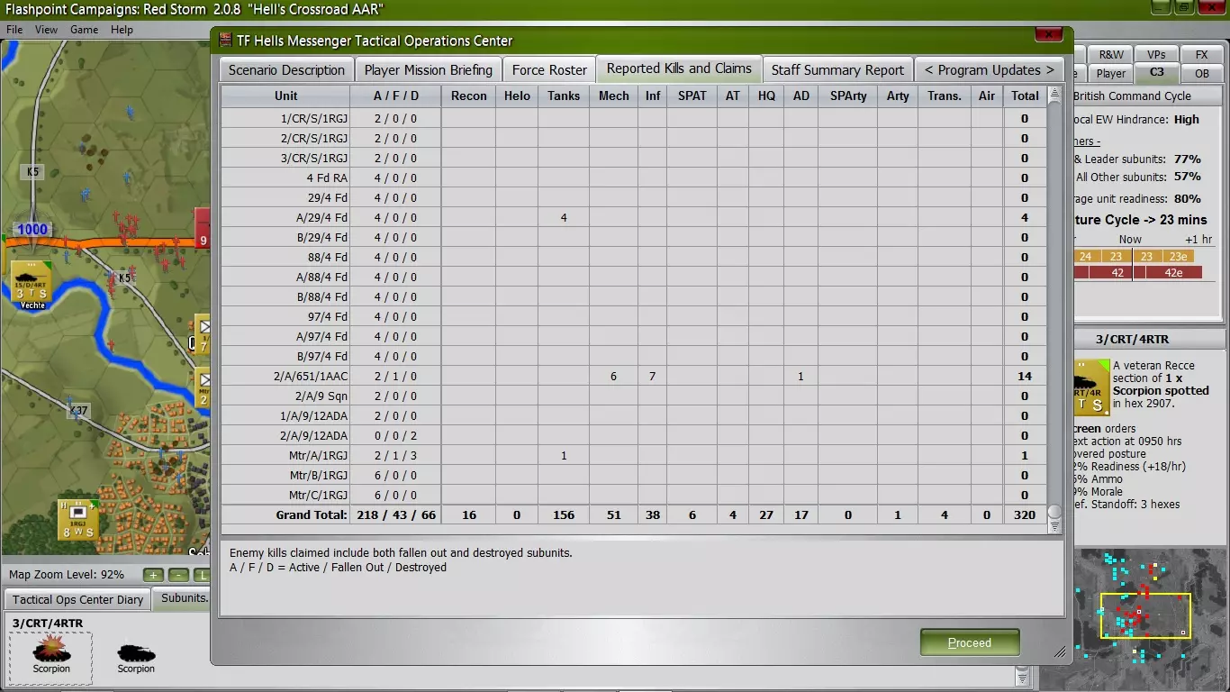 战斗进行到3小时17分钟时,苏军在损失70%兵力后停止进攻,开始巩固已占领的区域。虽然我对这场战术胜利感到满意,但仍能从中吸取一些教训(希望你也是如此),我将在下一部分讨论这些教训和结果。你不需要实际占领胜利点,而是需要在12个 hex(6公里)范围内拥有更强的单位影响力。如果我能更早地调动钳形攻势部队并进一步向南推进,或许就能在3000分胜利点的范围内获得更强的单位影响力。结果 总参谋部监察局发来贺电: 致:“地狱信使”特遣部队指挥官将军 * 在“地狱十字路口战报”战役中,您麾下价值9134点的部队在与价值14396点的敌军对抗中,夺取了59%的胜利点数(13633对9507)。监察局向您表示祝贺,并评定您的表现为称职且专业。 * 您的部队已摧毁敌方21个侦察单位、205个坦克单位、57个装甲运兵车单位、46个步兵单位、10个自行反坦克单位、4个反坦克单位、28个指挥部单位、22个防空单位、11个炮兵单位和15个后勤单位。 * 剩余部队统计: 现役:19个侦察单位、2个直升机单位、45个坦克单位、45个装甲运兵车单位、17个步兵单位、4个自行反坦克单位、11个反坦克单位、20个指挥部单位、2个防空单位、28个自行炮兵单位、6个炮兵单位、6个后勤单位和2个空中单位。 已损失:2个侦察单位、1个直升机单位、12个坦克单位、14个装甲运兵车单位、10个步兵单位、5个反坦克单位和2个指挥部单位。已摧毁:3个侦察单位、17辆坦克、26辆装甲运兵车、15个步兵单位、4个反坦克单位、2个防空单位、4个自行火炮单位和3个火炮单位。 * 战斗结束时,你的部队平均战备率为78%,指挥周期时长为23分钟。 * 你的部队遭受了22%的严重永久性损失,必须进行相当长时间的休整,以恢复46个已掉队的 subunits。 参谋评估完成。 当前部队预估状态: - 英军: 2英寸迫击炮(步兵支援单位)- 初始9个,已摧毁3个。 武装型“山猫”(攻击直升机-机炮/火箭)- 初始3架,已掉队1架。 “酋长”Mk 11(主战坦克)- 初始58辆,已掉队8辆,已摧毁17辆。 “雪貂”AOP(侦察单位)- 初始18个,已掉队2个,已摧毁3个。 FV432(履带式装甲运兵车)- 初始85辆,已掉队14辆,已摧毁26辆。FV432自行迫击炮(自行迫击炮)- 初始8辆,已摧毁4辆。 通用机枪(步兵支援单位)- 初始6挺,1挺故障退出,3挺已摧毁。 指挥部(指挥单位)- 初始19个,2个故障退出。 路虎(轮式通用车辆)- 初始6辆,无损失或退出。 M109A1自行火炮(自行火炮)- 初始24门,无损失或退出。 机械化步枪兵(步兵单位)- 初始36个,9个故障退出,12个已摧毁。 米兰反坦克步兵(反坦克步兵单位)- 初始20个,5个故障退出,4个已摧毁。 弯刀侦察坦克(侦察坦克)- 初始8辆,无损失或退出。 蝎式侦察坦克(侦察坦克)- 初始8辆,4辆故障退出。 侦察兵(步兵单位)- 初始6个,无损失或退出。 斯巴达MCT自行反坦克炮(自行反坦克炮)- 初始4辆,无损失或退出。苏丹(指挥车)- 初始3辆,无损失或退出。 狂风(近距空中支援机-机炮/制导炸弹)- 初始2架,无损失或退出。 履带式长剑(自行地对空导弹)- 初始4辆,2辆被摧毁。 我必须特别提一下几支值得授予勋章的【英雄】单位。