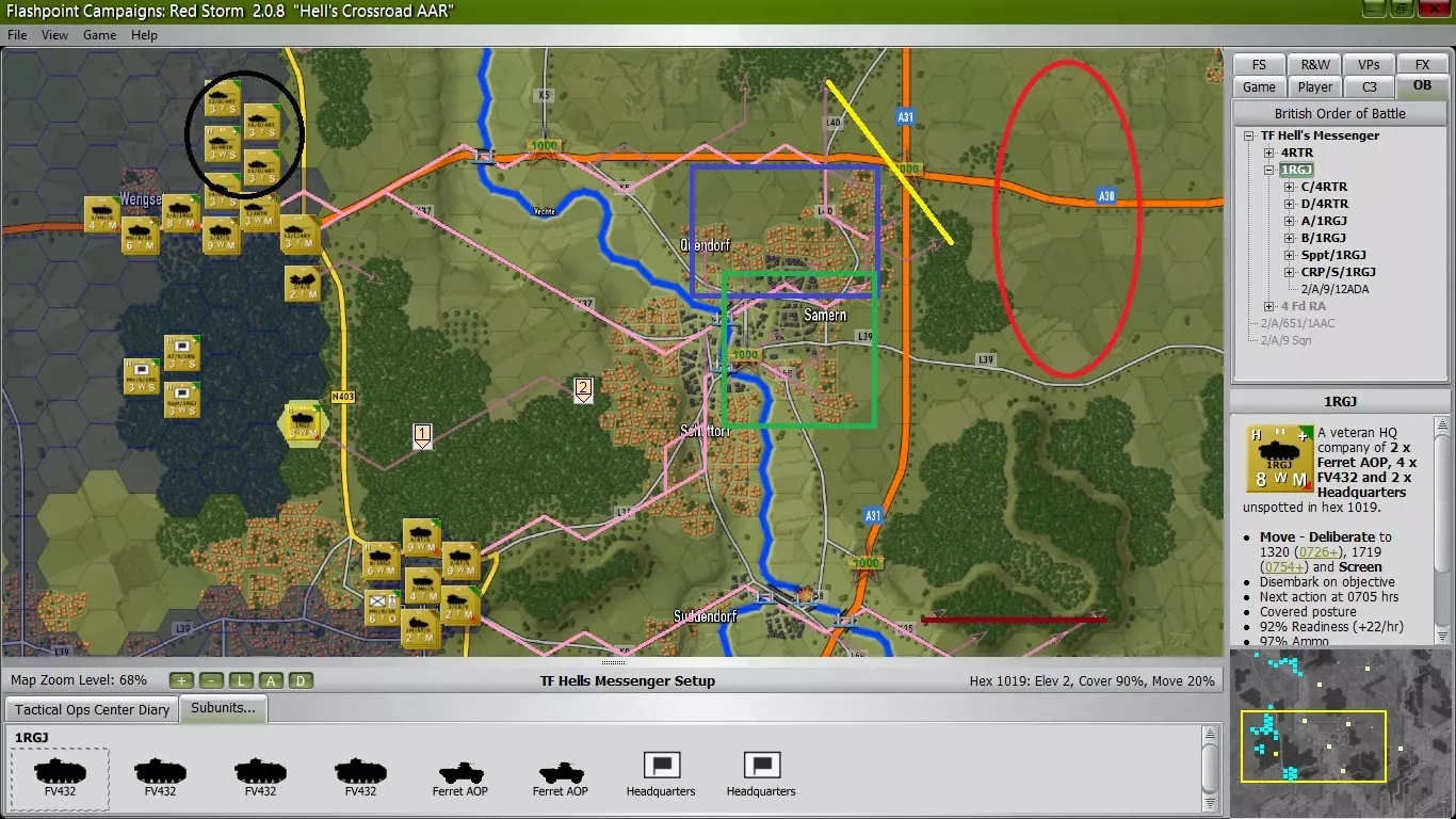 主力部队部署 1. 皇家绿夹克团奉命快速推进并占领城镇,C中队(黄线)将进入前沿阵地,以打击任何敌方侦察单位(红圈为交战区域);A连(蓝框)和B连(绿框)则进入城镇内部并执行坚守命令——此阶段,他们是唯一在最后一个路径点执行坚守命令的部队。 2. 我方侦察单位及配属的米兰反坦克导弹机动小组将向南移动(深红色线),以掩护该侧翼;D中队(黑圈)作为预备队被留在后方,其移动命令将在下一指挥周期阶段下达。