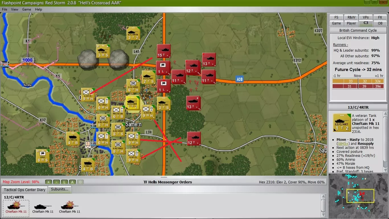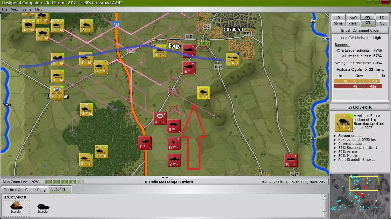 第一个指挥阶段顺利完成,钳形部队迅速且尽可能安静地抵达了指定位置(就坦克而言),主力部队则到达了城镇边缘并开始进入各自分配的阵地。第二个指挥阶段开始几分钟后,C中队与一支由T64B坦克支援的敌BDRM2侦察单位发生接触,局势瞬间失控。 按照计划,拥有14辆坦克的C中队为第1皇家绿夹克团A连和B连进入城镇内阵地争取了足够时间,但不幸的是,A连1排的一辆FV432装甲车及其步枪班在穿过城镇时被敌方炮火击中并损失。C中队与苏联坦克在近距离交火,成功击毁7辆坦克、5辆侦察车、17辆装甲运兵车(其中大部分为BMP)、13个指挥单位和8个防空单位,自身损失3辆。由于大量敌方指挥部被摧毁,我已将苏联的指挥周期延长至39分钟。可以看到,我的大部分步兵部署在城镇内,视线无法越过外围边缘,只有米兰反坦克导弹单位拥有良好的射界(红线所示)。我已命令所有迫击炮单位向己方前沿部队区域施放烟雾,以减少敌方火力打击,幸运的是我方坦克配备热成像仪,能够穿透烟雾进行观察。我的坦克部队发现大量红色装甲部队正朝着城镇方向推进,并有乘坐BMP步兵战车的步兵提供支援。情况很快就会变得非常糟糕,我至少还要等30分钟才能获得有效的炮火支援。 南侧侧翼