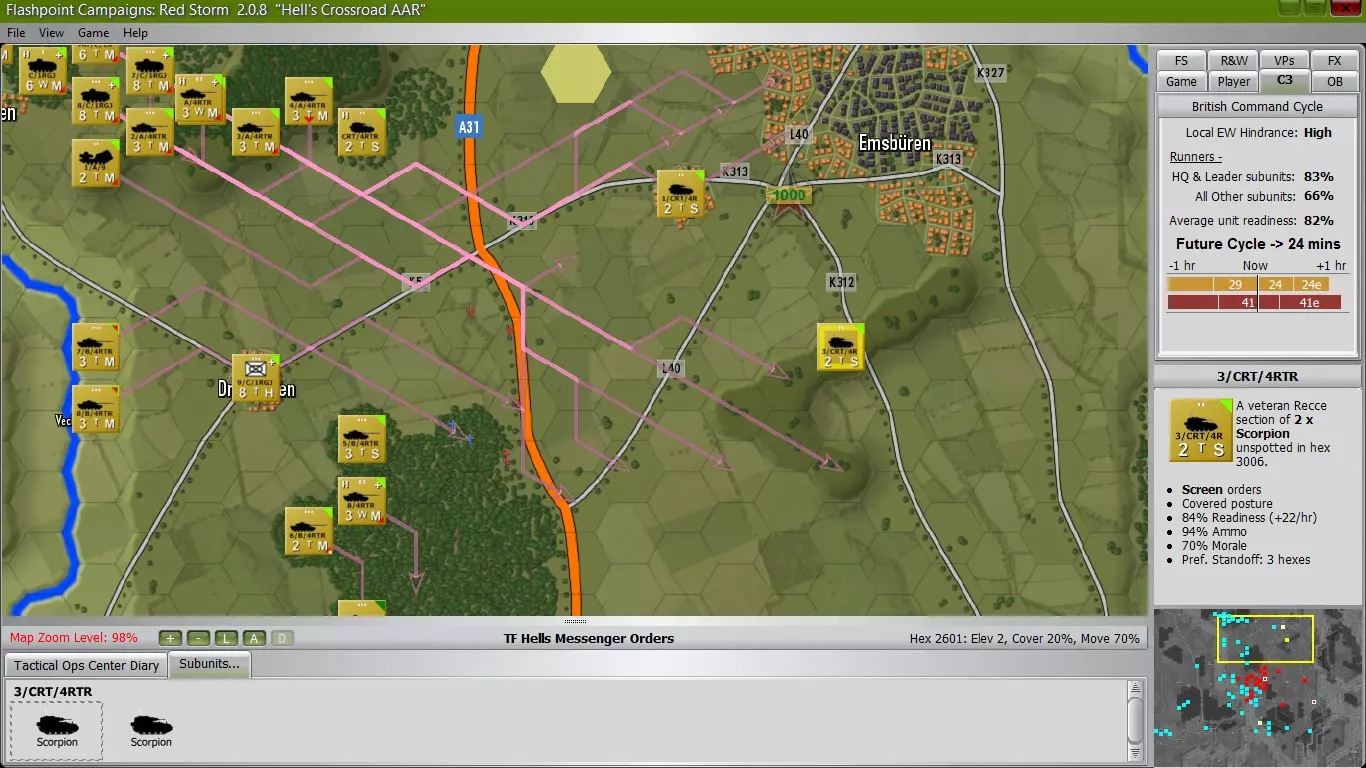 没有任何计划能在与敌人接触后一成不变。这句话是多么正确啊,我的计划虽然没有完全破灭,但肯定需要调整。皇家绿夹克团第1营的大部分兵力已遭受重创,如今只剩下零星的部队,他们的支援坦克也缩减为2支兵力不足的坦克分队。尽管如此,他们还是给苏军造成了巨大的伤亡。 现在我的炮兵已经就位,他们在城镇的北部和东部布设了一系列雷区,以扰乱敌人的行动,困住了几支坦克部队,并且即将对集结的坦克部队执行子母弹射击任务。只要皇家绿夹克团第1营坚守阵地,我的钳形攻势就会缓解压力,再加上子母弹攻击等大规模炮火支援。南翼 目前局势依然平静,因此我决定将部队向北调动。附近似乎只有零散的苏军残部,希望他们能配合我的炮兵(我会安排一个炮兵连直接支援两支前方侦察部队),抓住一些落单的敌军单位并将其摧毁。 钳形攻势 AI似乎已重新选择向北推进,投入了2个坦克连和1个BMP步兵营。这股力量在推进时直接进入了担任钳形攻势先锋的A中队的火力范围。我估计在接下来的一小时内,这路进攻的敌军部队将所剩无几。