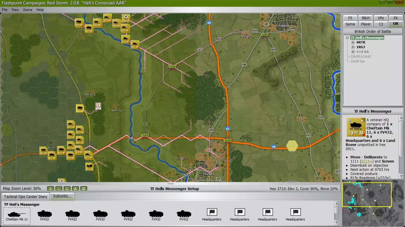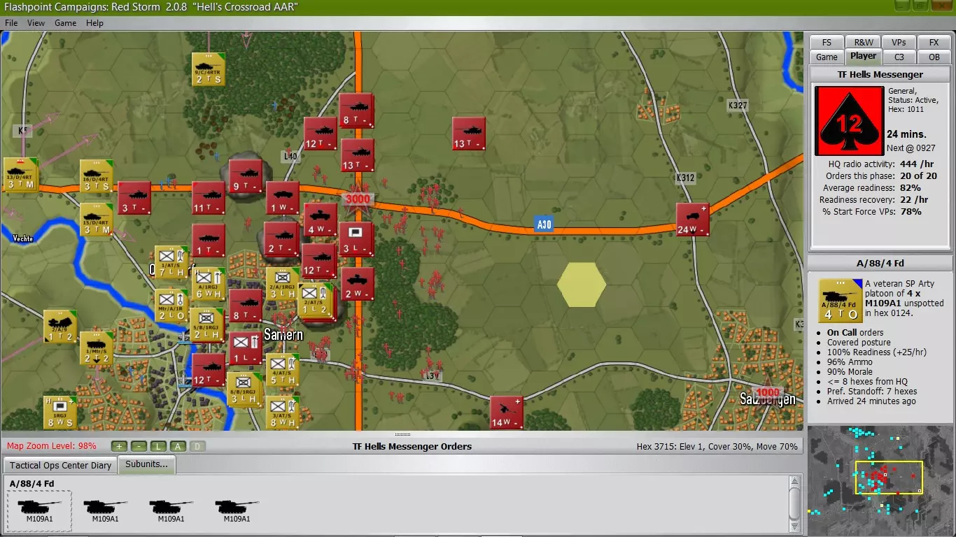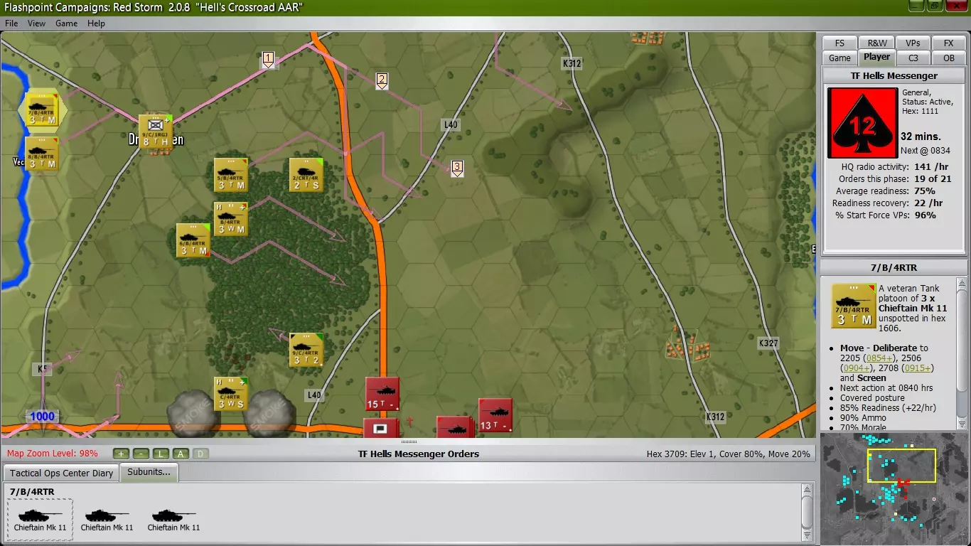 当发现苏军开始沿森林西侧向北推进时,我命令B中队停止移动。但现在那些苏军坦克已经掉头向南,随后向西行进,所以我已让A中队进入钳形攻势位置,同时C连正前往东北方向的城镇,以保障钳形攻击的侧翼安全。 好消息是,现在有两个炮兵连可供调用。不过由于启动了钳形攻势,我的指令点已用完,但还是成功让一个M109自行火炮排进入反炮火模式,希望能开始打击苏军炮兵。预计第三个炮兵连很快也将投入使用。其他说明: 由于在城镇内外的损失,我不得不对我的【编制序列】进行调整,因为我损失了2个【指挥部单位】,导致部分单位超出指挥范围。情况虽然有些混乱,但已得到纠正,因此我在【战备状态】/【士气恢复】以及弹药补给方面应该不会受到太大影响。 H+3 主力部队