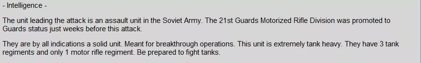 小型单位 1. 履带式“轻剑”地对空导弹,我方唯一的防空力量,仅有2个单位,每个单位配备2辆履带式“轻剑”导弹车,需将其部署在前线部队附近。 2. “瞪羚”直升机——1个武装型“瞪羚”直升机单位,配备火箭弹,除侦察外价值有限,除非能在敌方防空掩护范围外打击敌方侦察单位或BMP步兵战车。 3. 1架“狂风”战斗机——空中支援单位,在注意避开敌方防空单位的情况下十分有用。 敌方部队 根据玩家简报