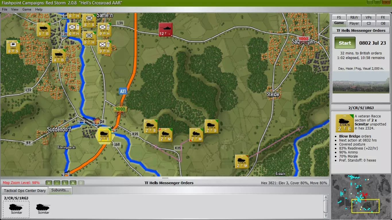 我已命令我的机动米兰导弹分队进入射击阵地,以掩护城镇南缘。同时,我已下令其中一支侦察部队炸毁桥梁,因为我不希望任何敌方单位渗透过河并进入城镇南部。钳形部队