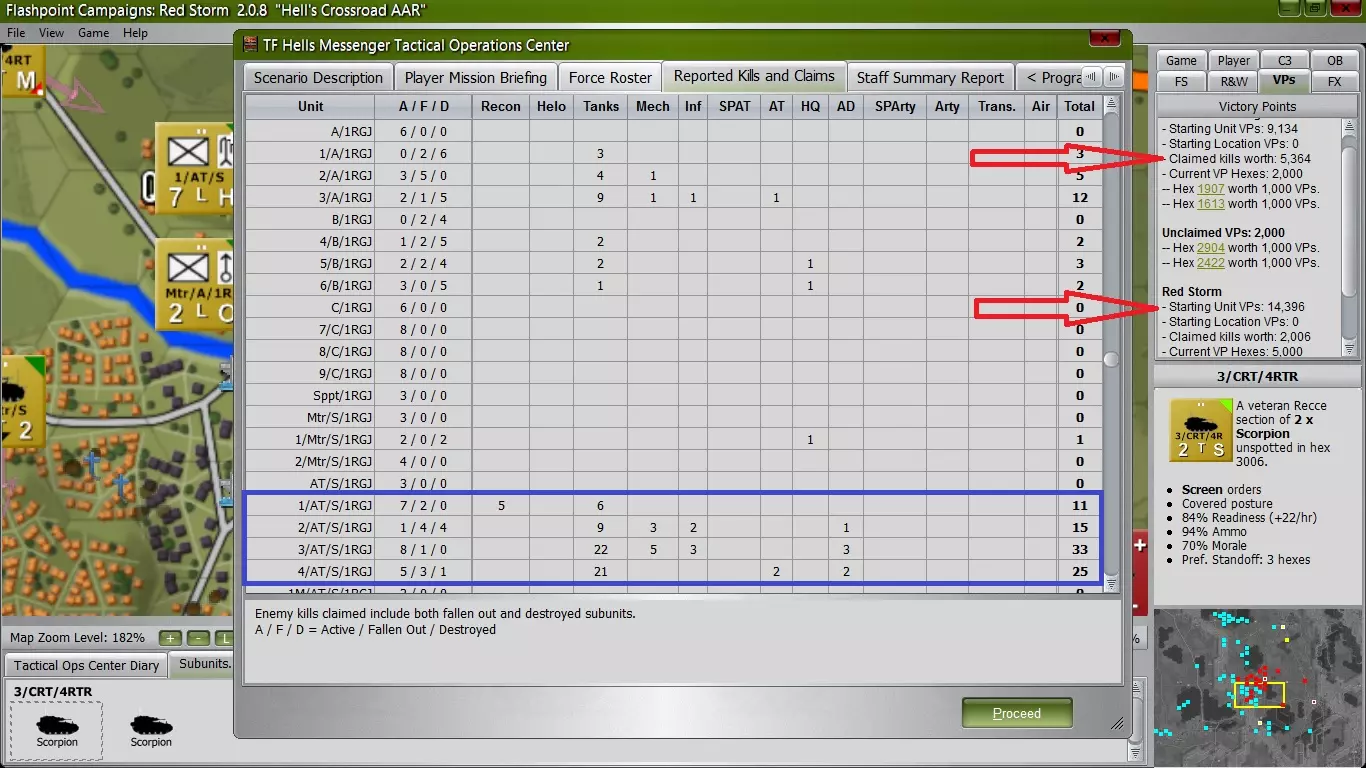 如果你注意到那条蓝线,那是我的瞪羚直升机的飞行路径。我试图利用树林和山丘来阻挡视线/射界,它们几乎完好无损地通过了,但在飞过森林和山丘之间1.5公里的缺口时损失了一架。当它们用步兵和地空导弹小组摧毁了6辆BMP步兵战车时,复仇的感觉很棒。现在它们只剩下19%的弹药,必须返回旅部重新装弹,希望我的一辆坦克能摧毁那个跟随其北部先头部队的SA8地空导弹单位。整体状态