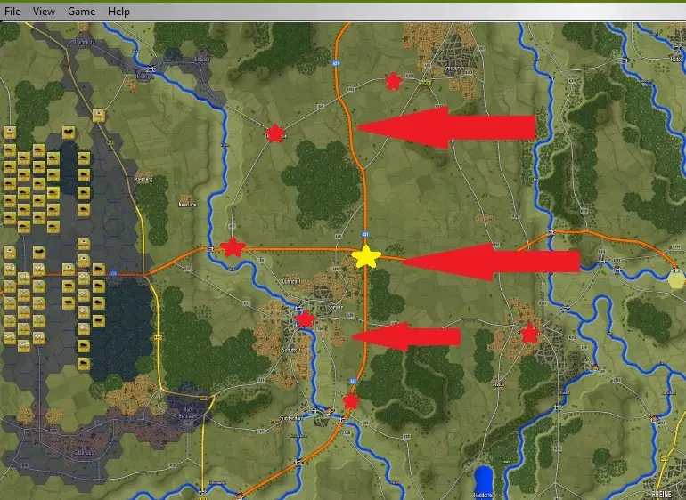 2.友军选项——我认为城市及林地周边的主要防御区域(金色轮廓)可由步兵在部分坦克支援下坚守,但预计敌方大量装甲部队会将我军逼退至城镇内,因此部署一支北部钳形部队(蓝色箭头),待敌军向城镇推进时向南迂回,从侧翼发起反击。该钳形部队在向南迂回前,需先确保其东北方向城镇的侧翼安全。 3.红色箭头标记的是若主要防御阵地开始崩溃时的备用方案。
