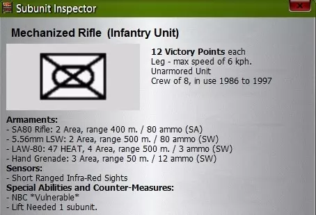 1个配备米兰反坦克小组的FV432步兵营,FV432步兵战车仅配备一挺中型机枪和轻型装甲,其作用和战场出租车相差无几。米兰反坦克小组均配备热成像仪,但射程有限,略低于2公里。