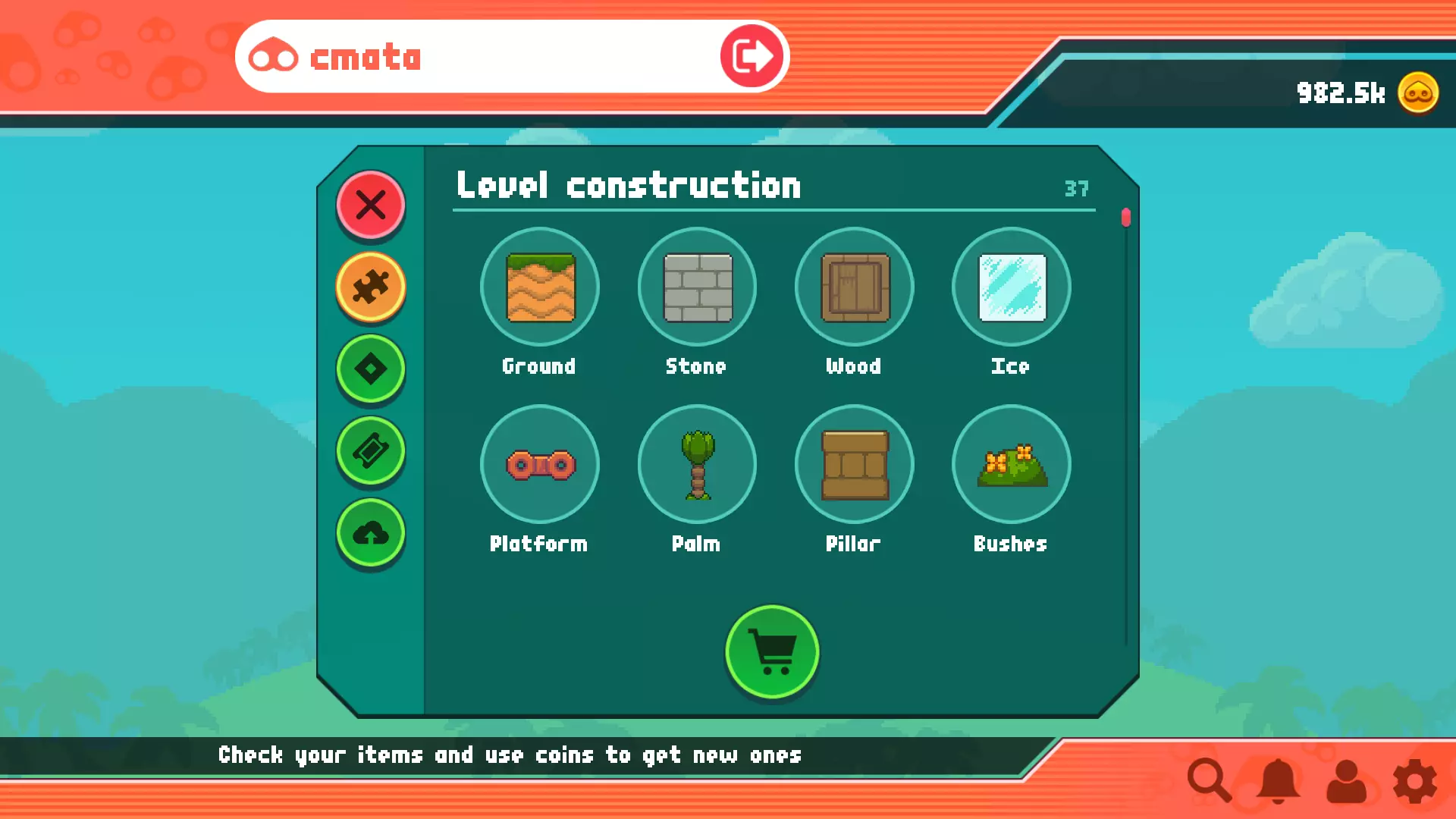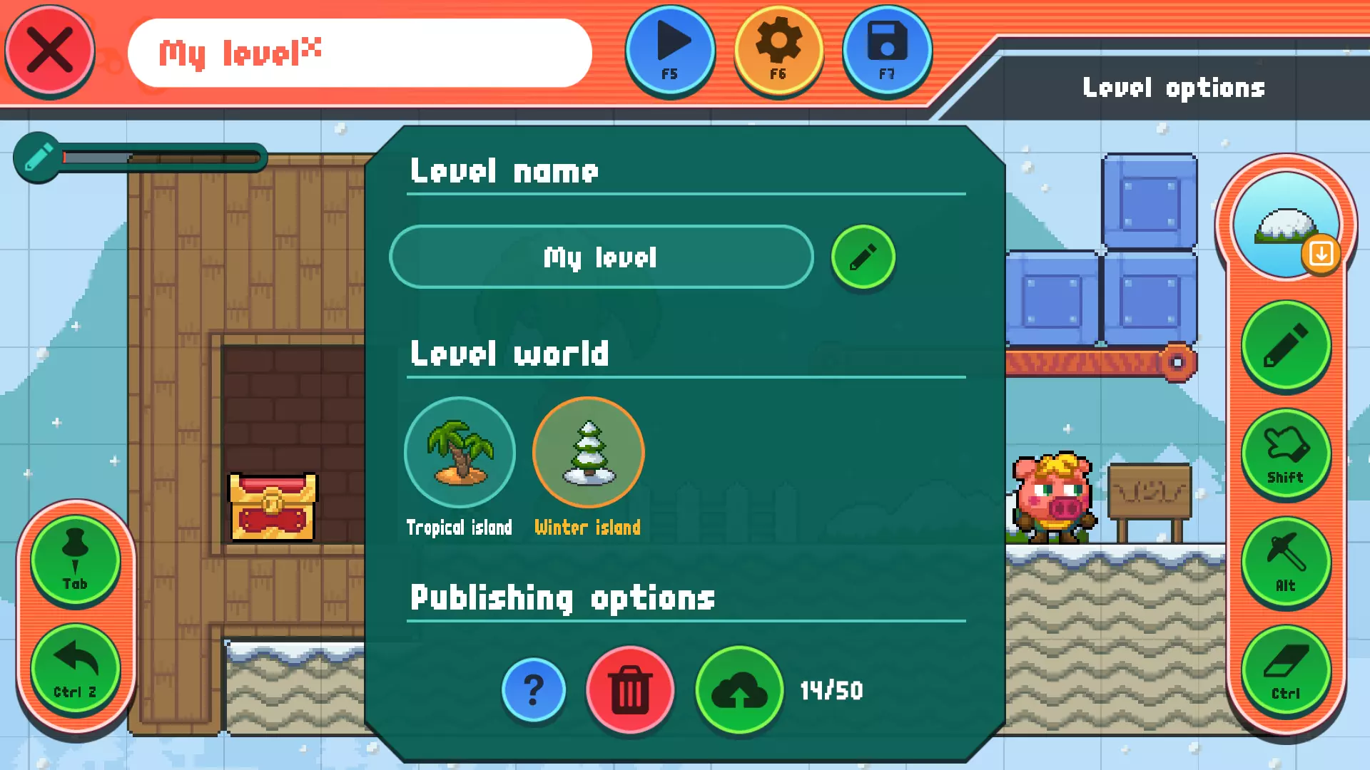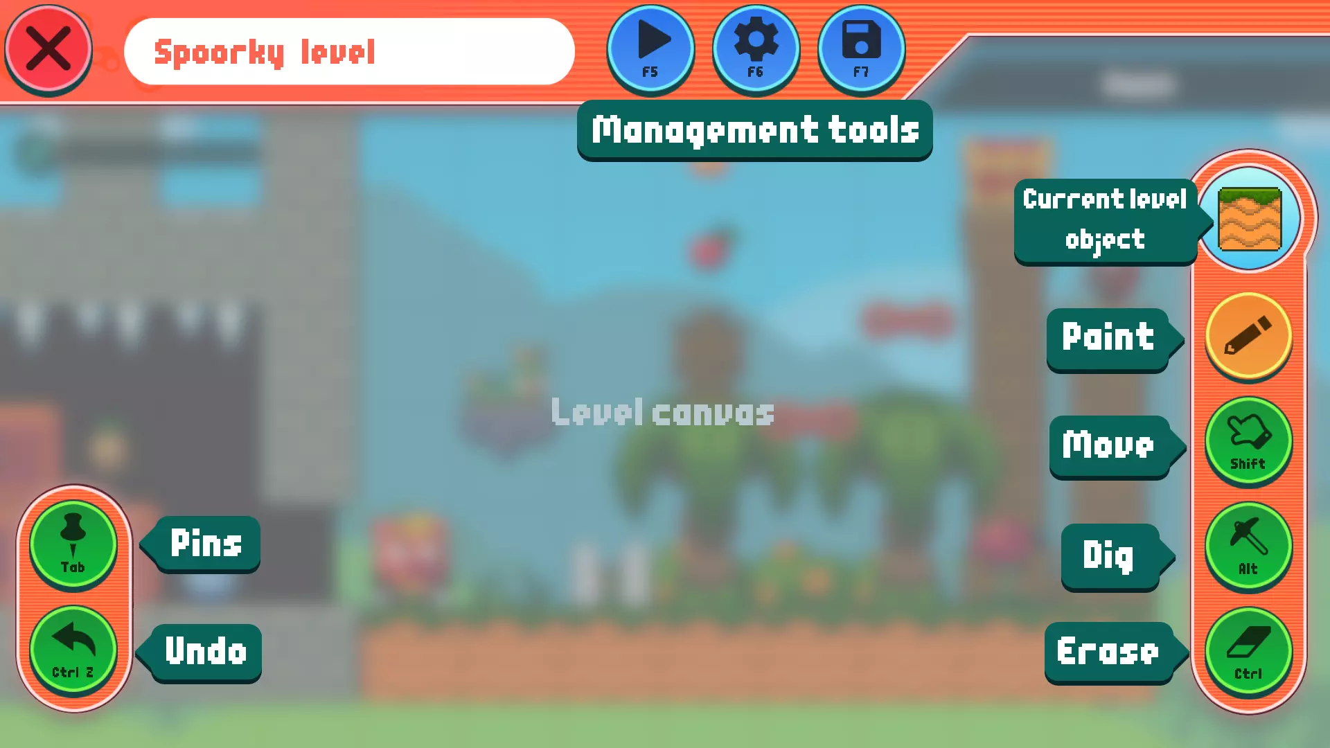 请注意,关卡物体根据其特性有一定的放置要求。例如,灌木丛、草丛或宝箱必须放置在实心方块上,不能悬浮在空中! 绘画工具:选择物体后,你可以通过移动鼠标(左键)/手指在关卡画布上绘制该物体。部分关卡物体无法在同一位置共存,这种情况下,新放置的物体会覆盖旧物体。 移动工具:使用此工具可选择画布上的物体并将其移动到其他位置。该工具会选择最近深度的物体。 挖掘工具:使用此工具可在实心方块内部创建通道和其他建筑结构。选择此工具时,不兼容的物品会显示为半透明状态。如果当前结构无法容纳任何通道,该工具将起到橡皮擦的作用。确保不要在角落使用此功能。 橡皮擦工具:使用此工具可以擦除任何你想要清除的关卡物体。