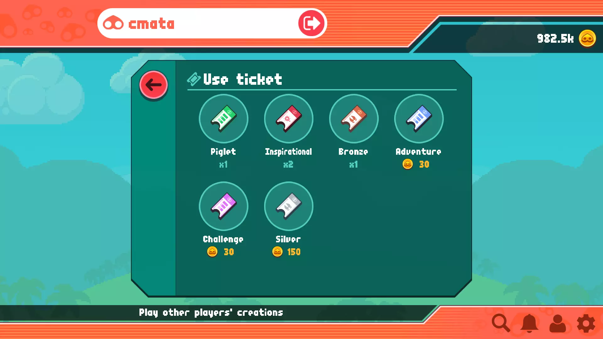 提示:请通过点击用户名附近的登出按钮、按ESC键或B键关闭游戏,以确保在多设备登录账号时能继续游戏进度。 底部栏选项 我们来介绍右下角的选项,这些选项功能相对简单。从左到右依次为: 搜索:通过ID查找用户和关卡,无法通过关卡名称搜索。用户ID即昵称,关卡ID是关卡信息中显示的小型字母数字代码(例如1T、2N等)。 通知:当其他用户与你互动(关注)或对你的关卡进行操作(分享、抢占你的领先位置等)时,游戏内通知会在此处列出。 用户资料:包含你的所有个人信息和账号管理选项。我们建议设置密码,以便日后找回账号并在多台设备上游玩。游戏设置。可配置游戏画面、音频和手柄。