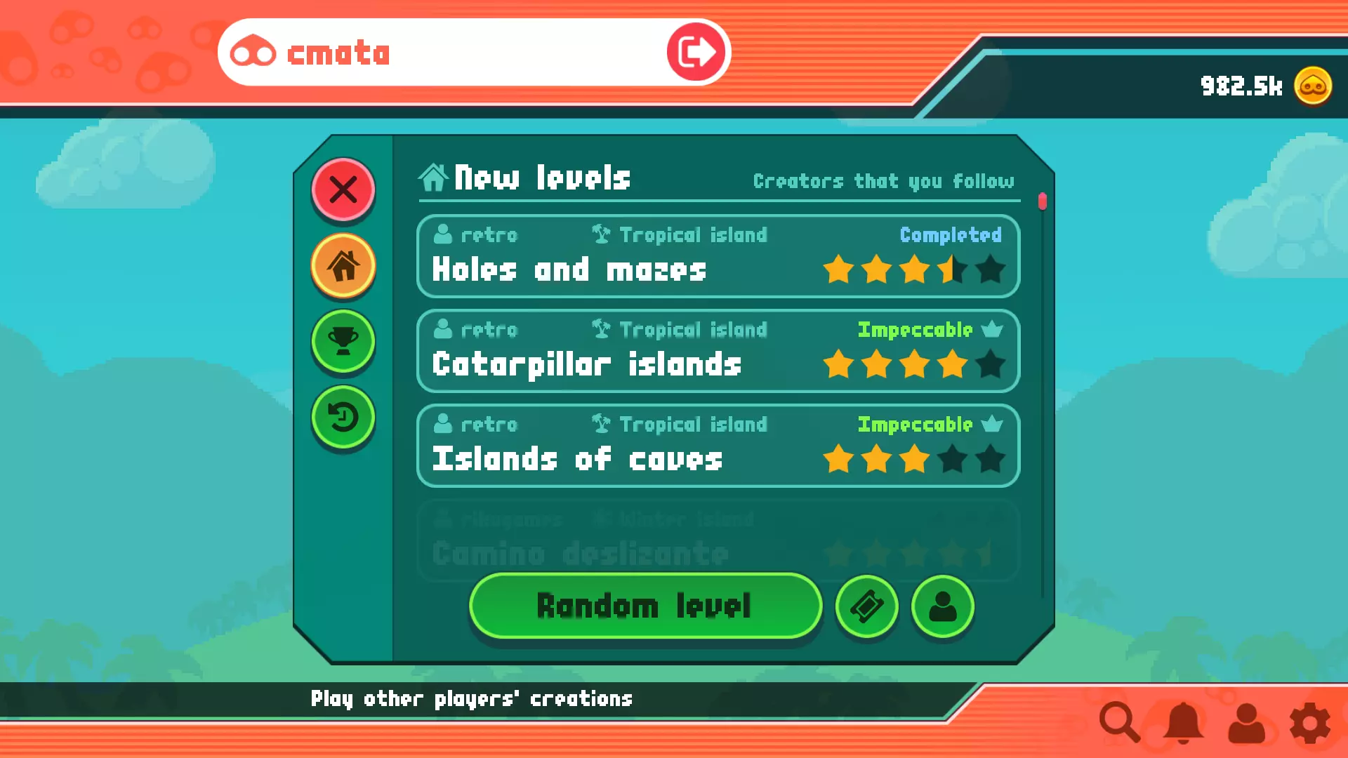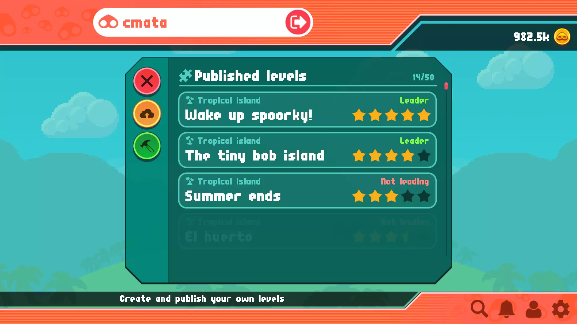 你可以在此处创建新关卡并监控已发布关卡的统计数据。你能快速了解自己是否在创作中处于领先地位。如果不是,你可以重新夺回第一名并获得【银蹄】作为奖励! 请注意,关卡草稿会在本地保存,直到你决定发布它们。删除游戏数据时请务必小心! 前往关卡编辑器部分了解更多关于此功能的信息。