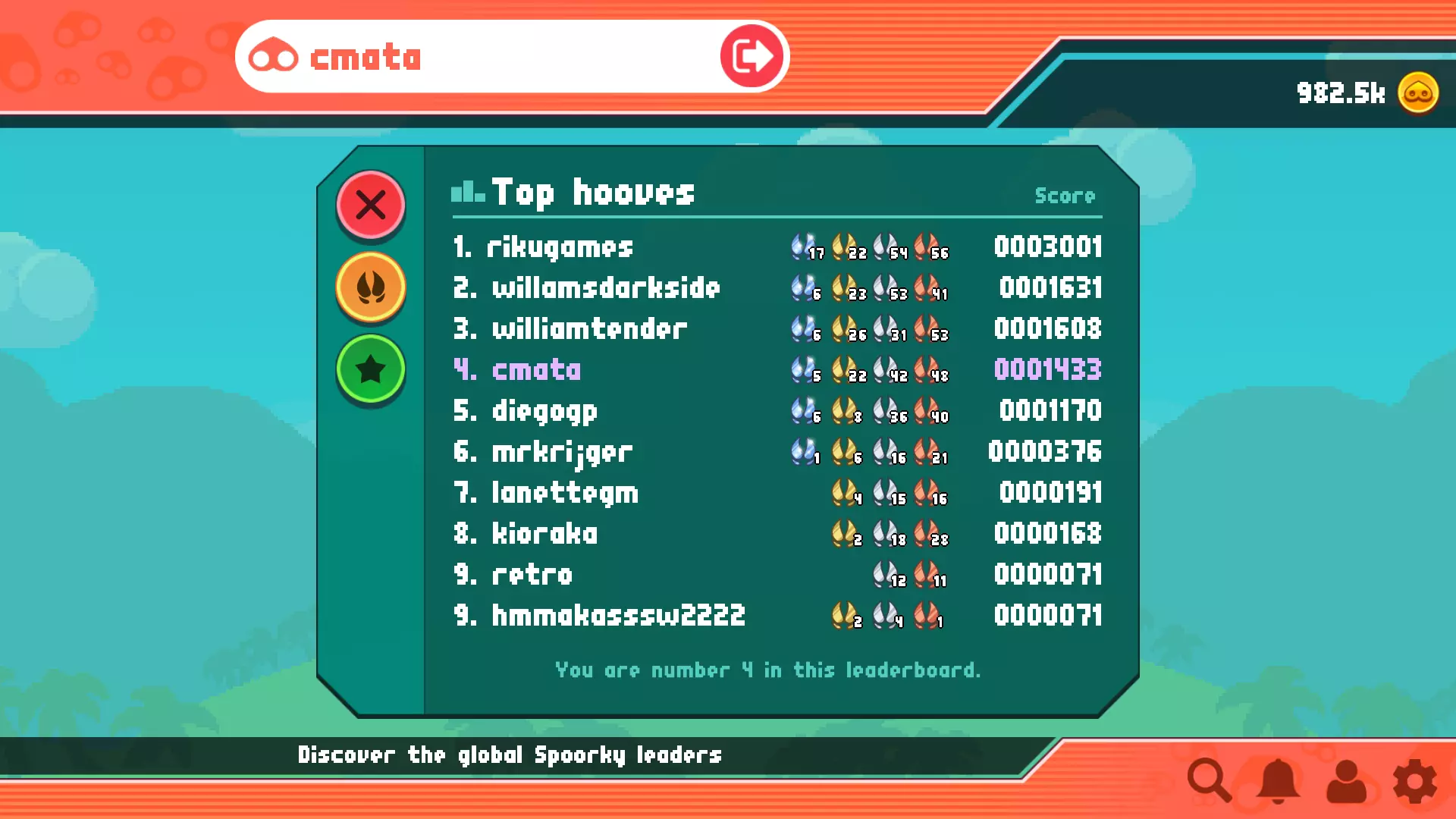 探索全球游戏排行榜,与其他玩家一较高下。所有用户都会根据获得的【Spoorky Hooves】获得全球游戏分数。但这并非唯一的全球排行榜,创作者们也会凭借其关卡评分展开竞争。 这里是发现有趣玩家和创作者的好地方,如果你想关注他人的话。 【Spoorky Hooves】:你的游戏分数 如果你是【Hoof Hunter】,你应该知道每个蹄铁会为你增加多少分数: 青铜蹄铁:+1分 白银蹄铁:+5分 黄金蹄铁:+25分 铂金蹄铁:+125分 在【Spoorky Hooves】板块中了解如何获得【Spoorky Hooves】。 关卡编辑器 你可以使用【Spoorky】关卡编辑器创建并上传自己的冒险。你可以在主菜单的“创建”选项中找到此功能。让我们简单介绍一下它!