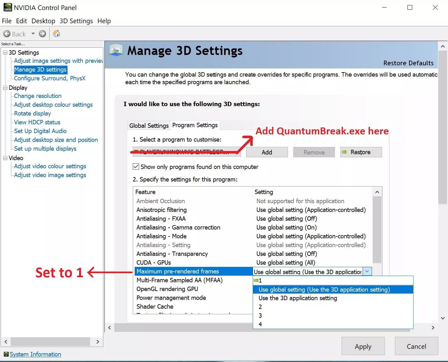只要游戏支持你的屏幕宽高比,一切都应该能正常运行。 请注意,之后游戏菜单中显示的分辨率会变为1280x800,但显然这是不正确的。你仍然可以自由调整所有其他设置,只是不要触碰分辨率设置,因为如果你更改了它,就必须重新进行相同的操作。 全屏模式下的帧生成时间问题 全屏模式下的帧生成时间非常糟糕,尤其是在启用垂直同步的情况下。无论帧率如何,相机移动都极其抖动且不稳定,这意味着无论你的帧率有多高,游戏仍然会感觉卡顿和不流畅。 值得庆幸的是,这个问题并非游戏本身固有的,是可以修复的。如果你使用的是NVIDIA显卡,请打开NVIDIA控制面板,进入管理3D设置,点击程序设置,点击添加并选择量子破碎.exe文件。 如果你最近打开过该游戏,它应该会自动出现在列表中。如果没有,该文件位于Steam steamapps common QuantumBreak dx11文件夹中。 然后你需要找到最大预渲染帧数设置,并将其设为1。点击应用并保持面板打开,因为稍后你还会用到它。 这里有一张参考图片(我使用的是网上的图片,因为我的控制面板不是英文的,且没有更改语言的选项)。