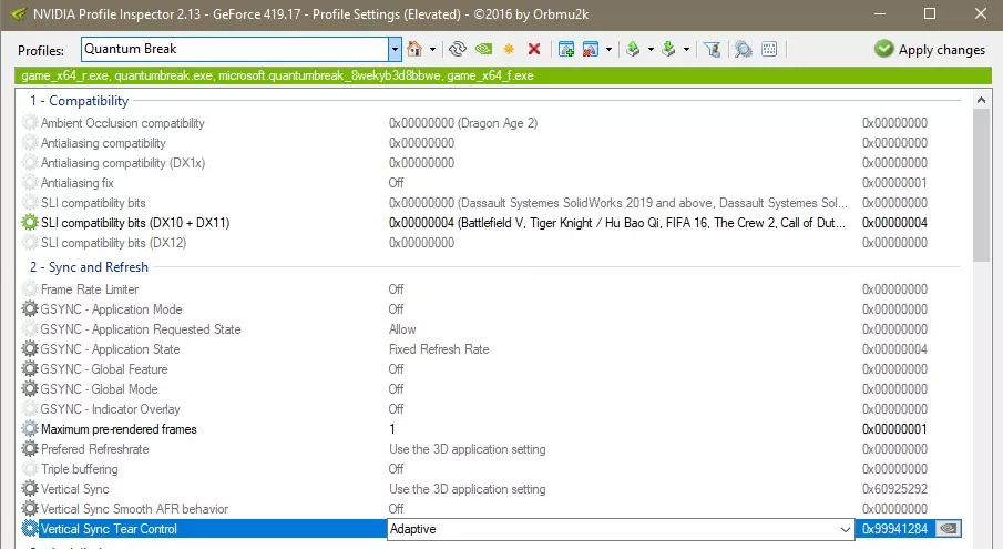 如果你正在使用G-SYNC,那么该选项将不可用,因为G-SYNC在设计上会在帧率低于最大刷新率时自动禁用垂直同步(V-SYNC)并接管帧输出。但遗憾的是,《量子破碎》强制30 FPS锁定的机制非常顽固,导致G-SYNC无法正常工作。 要在启用G-SYNC的情况下开启自适应垂直同步,你需要使用NVIDIA Inspector软件。下载并打开该软件后,搜索【量子破碎】,找到【垂直同步撕裂控制】设置,并将其设为【自适应】。