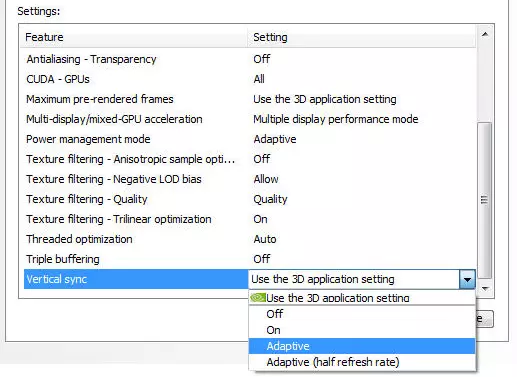 应用此设置后,帧率 pacing 应恢复正常,相机移动也会重新变得流畅。这类帧率 pacing 问题非常罕见,我已经很多年没有遇到过类似情况了。幸运的是,控制面板中的一个简单设置就能解决问题。 如果你使用的是 AMD 显卡,需要自行查找相应的设置,因为我对 AMD 工具没有使用经验。 更新:随着 NVIDIA 驱动的更新,此选项已更名为【低延迟模式】。将其设置为【开启】(非【超高】)等同于将【最大预渲染帧数】设为 1。 游戏过程中开启垂直同步时出现随机 30 FPS 锁定 继一系列严重影响游戏体验的问题之后,令人头疼的 30 FPS 锁定问题也出现了。该游戏采用了一种糟糕的双缓冲垂直同步实现方式(至少看起来是这样),当它“认为”你无法以最大刷新率维持帧率时,会将帧率锁定在刷新率的一半。这是游戏中出现过的最糟糕、最令人恼火的功能之一,会导致游戏体验出现难以置信的不连贯性。尽管这种情况相当罕见,但仍有一些例子,比如《刺客信条4:黑旗》,不幸的是《量子破碎》也在此列。 在《量子破碎》中,这种“功能”尤其恶意,我们将要使用的所有缓解方法可能并非在任何时候都有效,不过它们的效果还是非常显著的。 直接的缓解方法是启用自适应垂直同步。这样一来,每当你的帧率低于最大刷新率时,垂直同步(V-sync)就会自动禁用,理论上就不会出现30 FPS的情况了。 如果你没有使用G-sync,可以直接在NVIDIA控制面板中使用自适应垂直同步(Adaptive V-sync)。在你设置最大预渲染帧数的同一页面,找到垂直同步设置并将其设为自适应,操作如下。