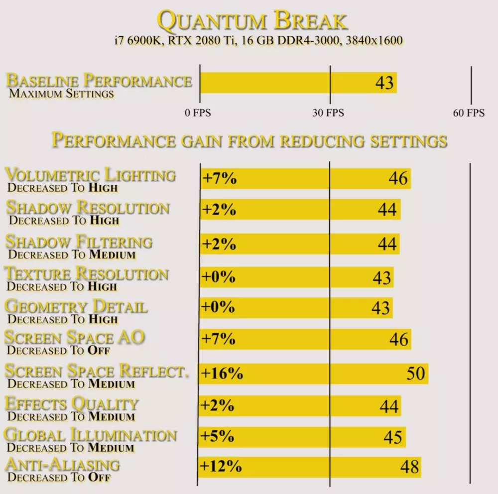 这会极大地影响许多场景的视觉效果,因此如果你要评判游戏画面或进行截图,请确保环境光遮蔽(Ambient Occlusion)功能已实际启用。 这也会对性能产生影响,因为环境光遮蔽在启动前是不存在的,所以刚加载进入游戏时的性能并非游戏的实际性能,环境光遮蔽大约在一分钟后才会激活。因此,如果你要对游戏进行基准测试,请等待它启动。 你可以很容易地判断环境光遮蔽何时启动,它会在某个时刻突然出现,同时伴有一次明显的卡顿。此问题仅会在启动游戏后首次加载进入游戏时出现,之后你可以自由加载所有存档和不同序列,无需担心此问题,但每次重启游戏后该问题都会再次出现。 较高的显卡配置要求 《量子破碎》即便不是目前市面上配置要求最高的游戏,也是其中之一,但与其他游戏相比,它的表现还算不错。这款游戏并非存在严重的优化问题,因为其显卡配置要求与其视觉效果是相符的。本指南所针对的是游戏存在的一系列不必要的、会影响游戏体验的技术性问题,正是这些问题而非显卡配置要求,使得游戏在默认情况下体验欠佳。不过,无论是否合理,该游戏对显卡的要求都很高,即便是大多数高端配置的电脑,也需要进行一些设置调整。我做了一些基础的基准测试,每次将每个选项降低一个等级,以找出提升性能的方法。以下是相关图表。