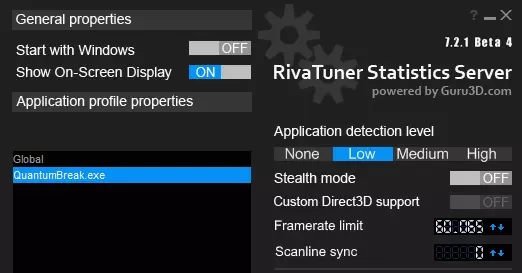 AMD的控制面板中也应提供相应选项。不过,这并不能完全解决问题。30 FPS锁定仍可能以某种方式发生,尽管频率低得多。但我们还有一件事可以做。我发现使用Blurbuster的低延迟垂直同步方法有助于消除剩余的30 FPS锁定。根据该指南,你需要在此处找到确切的刷新率,然后将帧率锁定在该数值以下约0.010Hz。其主要功能与我们在此尝试实现的目标不同,但它确实有所帮助,可能是因为它干扰了垂直同步的工作方式。因此,按照上述说明找到确切的刷新率,然后使用Riva Tuner Statistic Server将其锁定在该数值以下0.010Hz。RTSS的新版本已默认支持锁定小数赫兹的帧率,因此无需像Blurbuster指南中建议的那样修改配置文件(我当前使用的具体版本是7.2.1 Beta 4)。 打开Riva Tuner Statistics Server,从Steam的steamapps common QuantumBreak dx11目录中添加QuantumBreak.exe,然后将帧率锁定在比你的精确刷新率低0.010赫兹的数值。 例如,我的刷新率是60.075赫兹,所以我将帧率锁定为60.065赫兹,操作方式如下: