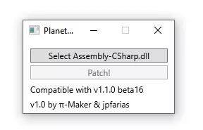 1. 运行补丁程序文件。 2. 点击【选择Assembly-CSharp.dll】。 3. 在新窗口中导航至游戏文件夹,然后依次进入【Planetbase_Data】和【Managed】文件夹。 4. 选择【Assembly-CSharp.dll】文件并点击【打开】。 如果您通过Steam安装游戏,该文件路径通常为【C:......Steam steamapps common Planetbase Planetbase_Data Managed Assembly-CSharp.dll】。 如果您未通过Steam安装游戏,请在您安装游戏的目录中查找所需文件。在开始操作前,为了以防万一,请备份您的Assembly-CSharp.dll文件。 5 - 点击【Patch!】 6 - 等待补丁程序完成其工作。当按钮显示“Done!”(完成!)时,操作即结束。 7 - 关闭补丁程序。 要检查游戏是否已打补丁: - 启动游戏时,查看主菜单右下角显示的版本号。如果游戏成功打补丁,版本号后会添加一个点。(例如,若您原本的版本是1.3.7,打补丁后版本将显示为1.3.7.)当Steam推出游戏更新时,很可能会替换已打补丁的版本,因此您需要重复此过程并重新打补丁。补丁及说明作者:jpfarias补丁作者还发表了评论: "- 感谢PiMaker提供此补丁的基础。 - 一如既往,我不对使用此补丁或我的任何软件可能发生的任何情况负责。使用它的风险自负。" 补丁【Planetbase Mod Patcher】与《星球基地》的所有游戏版本兼容。其界面显示适用于游戏1.1.0版本,但在其他版本(包括1.3.8版本)中,该补丁同样可以正常运行。如果补丁无法安装