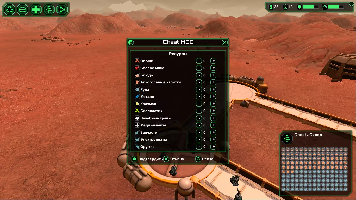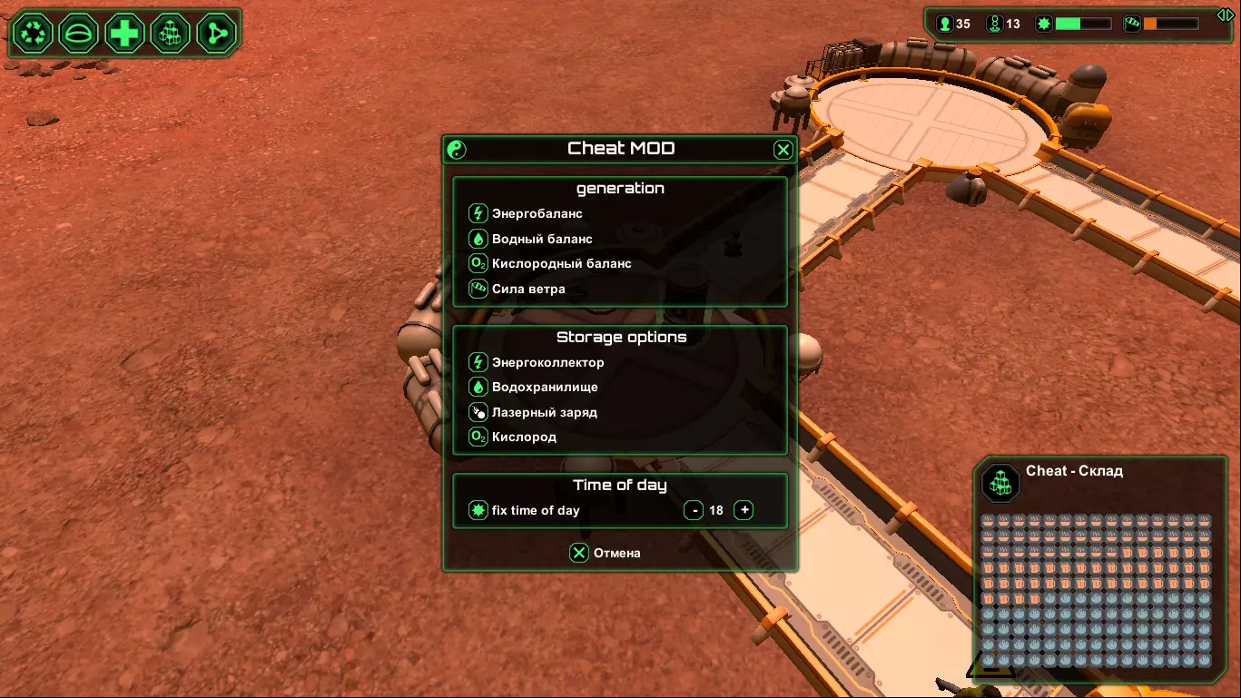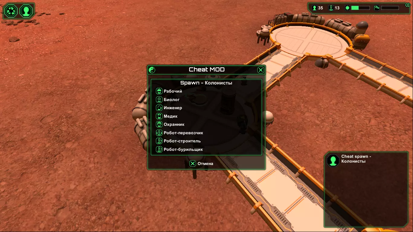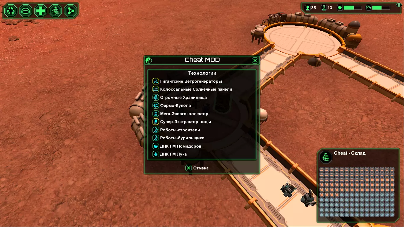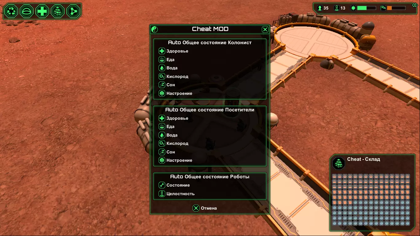 关于《星球基地》作弊模组的视频: - 俄语视频“PlanetBase 作弊器 / 作弊面板 / 作弊菜单 / Cheat Planetbase” - “Planetbase - Cheat Mod” 第一期,文件 - “Planetbase - Cheat Mod, Update” 第二期,文件 - 法语视频:作弊模组使用示例 说明:该模组未在NexusMod资源平台上发布。- 作弊模组的具体作者未知。很可能是WladV。(若有更准确的信息,请在评论区留言,以便更正)。 - 该模组在互联网上的不同网站有多种版本。 - 我已尽力查找并在下方提供该模组最新版本的相关内容。 - 若版本未进行俄文本地化,则模组文本不会被翻译。如果有人知道哪里有更新的版本,或者可以查看源代码,又或者如何联系作者,请在指南的评论中告知。 游戏内使用说明: 安装此模组后,进入游戏(无论是新游戏还是继续游戏),在封闭建筑菜单中应会出现一个名为【作弊模组】的新建筑。此作弊模组添加了两座建筑,其中一座是名为【魔法建筑】的室内建筑(即房间)。 第二座建筑是【机场跑道】(室外建筑),它能无限生产电力和水,同时也是通过特殊菜单召唤飞船的着陆平台。 没有【机场跑道】就无法召唤飞船。 在飞船菜单中,可以召唤飞船,通过飞船可以运送物资、人员或技术。修改器功能: + 添加内容 . 清理区域(效果佳) . 最佳无线电天线 . 自动消灭敌人 . 额外声望值 . 其他功能 - 移除内容 . 空引用异常 . 其他错误 安装方法: 1) 确保游戏已打补丁且补丁程序正常运行。(在游戏主屏幕右下角,版本号旁会显示相关标识) 2) 确保已安装重定向器。 3) 下载所需修改器文件。4) 解压并将模组文件放入"%UserProfile%/Documents/Planetbase/Mods"文件夹。 5) 享受游戏! 通常与作弊模组一同提供的文件: а) CheatMod.dll - 这是作弊模组的主文件。 б) Patcher.exe - 该文件中通常包含补丁程序。如果您的游戏已完成补丁更新,则无需操作此文件。 в) Readme.txt - 说明文档 г) Redirector.dll - 重定向程序。如果您已安装过重定向程序,则无需对此文件进行任何操作。源代码:暂未找到相关链接。如果您知道,请告知社区,并在下方评论中写下本指南的相关信息。 作弊模组(Cheat-Mode)链接:在其发布的网站上通常会附有安装说明。但如果您的游戏已打补丁并安装了重定向器,则无需重复操作。 进行任何操作前,请先创建备份。 1)(2017年8月20日)2)(2017年1月8日) 3)(2016年3月21日)版本[1.1.0.beta.15.mod(2016.03.21)]{WladV} 4)作弊模组/Cheat-Mode [1.21](2017年1月8日) 补充: 法语视频(关于作弊模组):- [Fr]“MOSD DE RECURSOS INFINITOS PARA PLANETBASE” Part-1(2017年9月29日) - [Fr]“MOSD DE RECURSOS INFINITOS PARATE 2 PARA PLANETBASE” Part-2(2017年10月16日)4 - 挑战(任务)编辑器