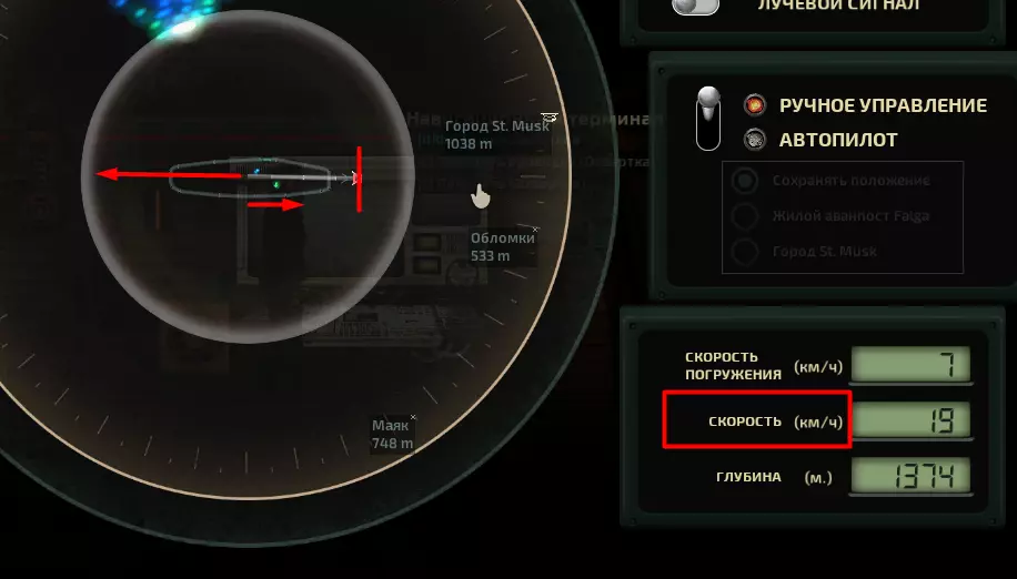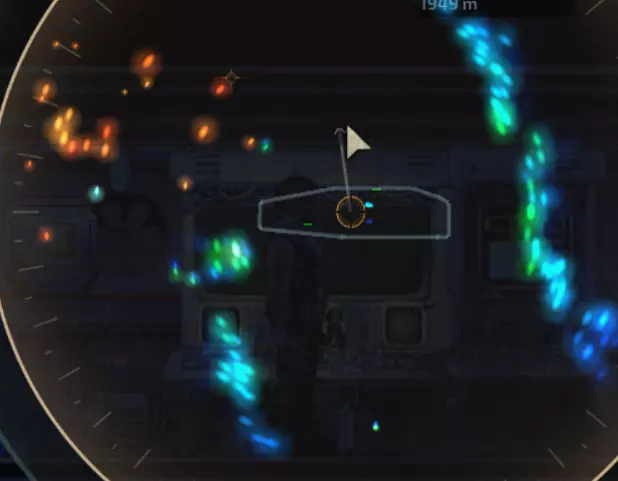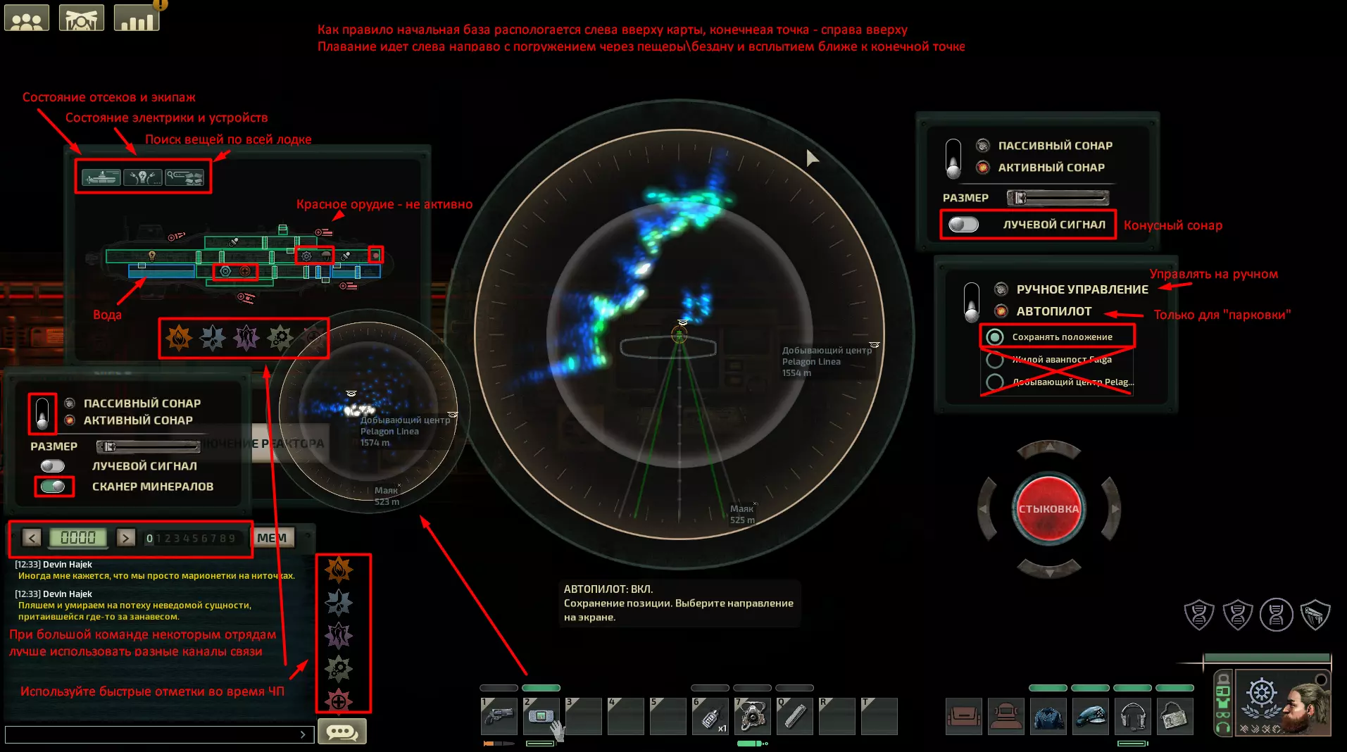 航行通常是从左向右进行:潜艇会出现在地图的左上角,而航线的终点则位于右上角。这些基地的上方通常是地图的边界,深渊的底部也是如此。航行会沿着蜿蜒的路径进行(在有洞穴的生物群系中),需要先向下潜,然后再上升到基地。有时你可以潜入深渊,在开阔区域航行后再次上升到洞穴中。让我们来了解主屏幕: 1) 几乎需要始终手动操控潜艇。在此模式下可以提升驾驶技能,而技能较高时,潜艇的行驶表现会比自动驾驶更出色、更高效。 2) 自动驾驶用于保持位置,或者当你只需将潜艇移动到安全的短距离位置时使用。此外,与空间站对接时最好使用自动驾驶,此时你只需平稳调整向量的终点位置。3) 不要在初始或终点站点使用自动驾驶——它非常不稳定,你的潜艇会在某个柱子附近低效地晃悠并消耗燃料。 4) 声呐、发动机、制造机甚至船员的奔跑都会产生噪音,怪物会听到这些声音。如果把这些都关掉并保持安静,就可以依靠被动声呐和发动机低转速,悄无声息地从利维坦或海沟蠕虫身边驶过。5)由于主动声呐会在最大距离上吸引怪物,所以请在不使用时务必将其关闭——例如,当你们把船停靠在洞穴废墟残骸旁,且几乎整个队伍都要外出时。 6)激光声呐会朝你所指向的方向发射锥形信号。这是介于全声呐和被动声呐之间的中间模式,如果你不想引起过多注意,但又需要继续前进的话可以使用。不过它的使用频率较低。 7) 合格的船长应该同时使用手持声呐和主声呐。当你靠近洞穴墙壁时,通过手持声呐可以发现矿物。如果不留意这一点,你将会错过大部分唾手可得的资源。收集表面上的东西比再次装备探险队进入危险洞穴要容易得多。 8) 在主声呐的左侧是船只状态显示器。在这里你可以看到氧气不足、进水情况、船体状态以及船员在舱室中的位置。另一个标签页会显示所有电力和设备的状态。在第三个标签页可以输入物品名称,系统会显示船上该物品的数量。 机械师拥有天赋,能生成类似第一个显示损坏情况的状态监控界面。而工程师则有类似第二个显示电力情况的监控界面。