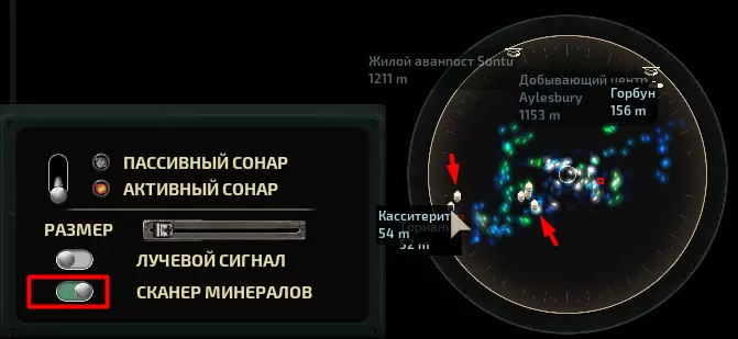 椭圆形的小绿点是 artifacts(遗物)。左边的小点是 dead slider(死亡滑行者)。Raptors(迅猛龙)比它稍大一些。细长的小点是 tiger sharks(虎鲨)。非常小的细长斑点是 spirelins(螺旋虫)。Hammerheads(锤头鲨)标记为几厘米的实心点。大椭圆形点是 moloch(摩洛克)。大圆形点是 observer(观察者)。非常大的形状不明的点是【危险信号】。意思是你有麻烦了,不是指水下的屁股。手动声呐开启矿物搜索功能后,资源会被清晰的白色标记标注,将鼠标悬停在标记上会显示矿物名称。可采集的植物不会被标记。