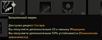 这可不是什么电子烟。【潜渊症】里的硬汉雪茄能让抽完它的人在死后免除收割者的税。它还能消除精神错乱并提供相应抗性,但这些都是小事。医学加成很有用,因为船长的医学技能最低,有了这个加成他多少能有效地治疗自己或他人。还有化学加成。依赖性实际上是个有用的东西,但前提是你(或者你的医生)了解药物并且积极使用它们。 这两个天赋都不算关键,选择哪种物质来强化自己完全看个人喜好。不过我会选酒鬼,因为它有抗性加成。