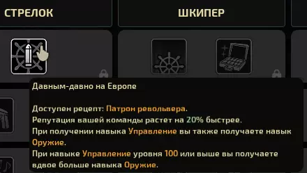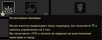 《潜渊症》船长天赋树按明确功能划分: 1) 第一分支【射手】强化船长自身及其战斗技能。 2) 第二分支【舵手】围绕勋章展开,勋章可为选定的船员和船长自身提供额外经验。 3) 第三分支【船长】专注于命令反馈,强化全体或部分船员。在游戏开始时,几乎在所有情况下我都建议选择第二个技能分支,并点选获取收益和勋章的天赋。这样我们和船员就能快速升级,并且从船长角色中获得最大收益。 接下来我建议选择第三个技能分支——以便通过命令增强船员,或为他们提供生命值加成。第一条技能树只对船长本人有利,对船员来说,只有能在死神(原词:жнеца)降临后减轻负面影响的雪茄,以及通过击杀获得的额外金钱是有用的。 如果你不打算快速培养船员,并且确信在长期航行中你和船员们都能升级到所需的一切,那么可以根据个人喜好选择技能树。这对你的游戏玩法不会产生根本性影响。 那么,第一个技能树【射手】: