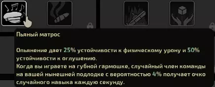 这是一个无论是战斗型还是掌舵型船长都很实用的天赋。用口琴演奏时技能提升速度相当慢,但好在航行时也能演奏,而且没有任何限制。它还能为你们的潜艇增添些许氛围。对醉酒状态的高抗性是个很棒的特性,让我们可以在保持清醒的状态下掌舵。