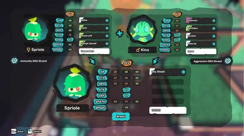 继承个体值与特性 每只新孵化的腾兽的个体值有40%的几率继承父母中该属性较高的个体值,40%的几率继承父母双方该属性个体值的平均值,还有20%的几率继承父母中该属性较低的个体值。这意味着你新孵化的腾兽平均会比它们的父母稍强一些,你可以从繁殖预览菜单中注意到这一点。但由于每只腾兽只能繁殖特定次数(取决于其生育率,高个体值的腾兽初始生育率较低),你需要一种更可靠的方式来传递属性。这时DNA链就派上用场了!这些道具在繁殖中心出售,可以装备到父母腾兽身上,以确保其传递特定的一项或两项属性。繁殖两只在同一属性上拥有相同个体值的腾兽是确保后代继承该个体值的另一种方法。如果腾兽携带【基因工程DNA】道具,还可以从父母一方那里继承特定特性!