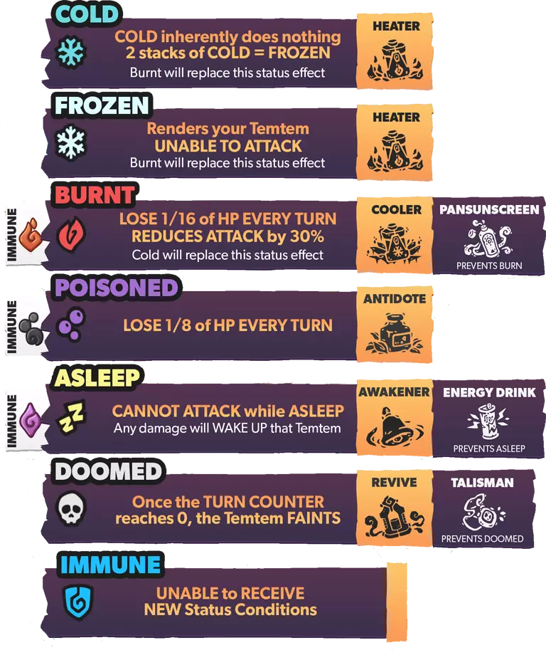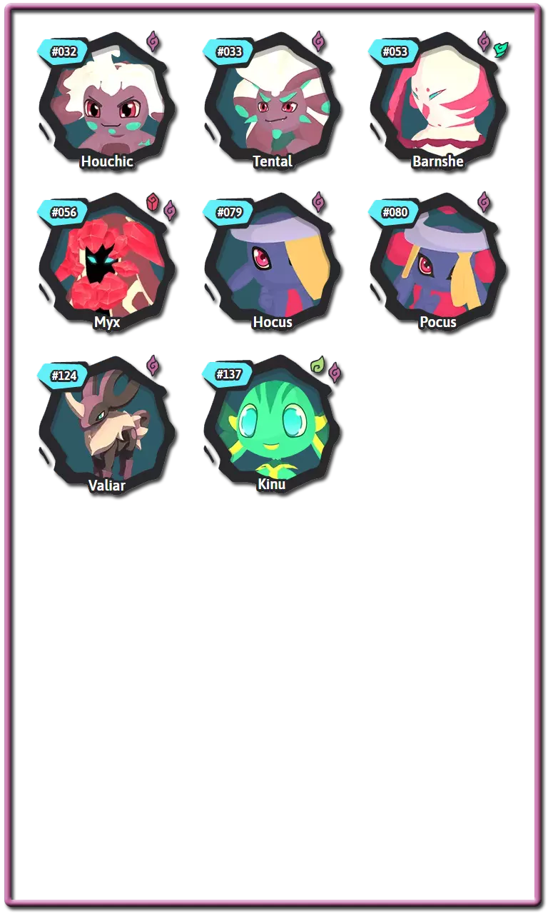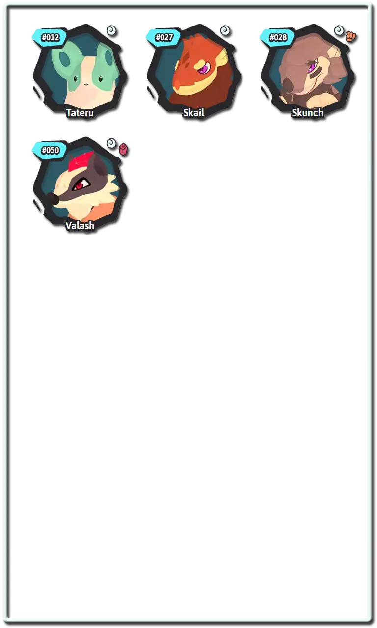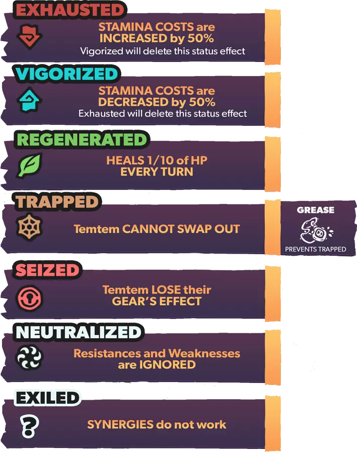 腾兽拥有名为【特性】的特征,该特征会以某种方式影响它们的战斗。大多数腾兽可以拥有两种不同特性中的一种,而有些腾兽则只有一种。这些特性只能是正面或负面的,并且通常在腾兽出生时随机选择。进化时,许多腾兽会获得一组新的特性。进化后腾兽的特性将与未进化腾兽的特性在腾兽图鉴中处于相同的位置。 通常情况下,通过繁殖出生的腾兽的特性是随机选择的,但某些装备道具可以强制父母将其特性传递给后代。 以下是腾兽中使用的所有特性及其拥有者: 复仇者:当一名队友倒下时,特攻和速度提升1级。风行者:使用风系技能时,伤害提升15%。拥有者:萨克、巴恩谢、泽菲拉夫 两栖:受到水系技能攻击时,速度提升1个等级。拥有者:福姆、赛帕特、克里斯特尔、鸭嘴兽、比古 厌氧:使用剧毒技能攻击时,自身特防提升,特攻下降。拥有者:沃拉伦德 药师:使用特殊技能攻击时,若目标为对手则使其进入1回合中毒状态;若目标为队友则使其进入1回合再生状态。拥有者:奥菲伊尔 恩赐者:当队友受到伤害时,自身最大生命值恢复10%。拥有者:基努 植物学家:使用自然系技能时,额外增加15%伤害。拥有者:洛阿里、希多迪、萨克、斯普里奥 植物恐惧:受到自然系技能攻击后,伤害提升50%。拥有者:甘奇、卡拉比斯 强壮:受到物理技能攻击时,额外承受20%伤害。斯肯奇、巴布翁 【恃强凌弱】当我方腾兽数量多于对手时,造成的伤害提升30%。 格兰帕、斯肯奇、马斯蒂欧尼、布鲁兹 【提神醒脑】免疫睡眠状态。 帕哈拉、卡库、玛格米斯、乌米希、沃尔维尔、邦邦 【厚皮】受到物理技能攻击后,防御提升1级。 瑟尼夫 【同袍之谊】若伙伴腾兽与自身为同一进化链,则受到攻击时减免50%伤害。 帕哈拉、雷拜尔、斯普里奥、沃尔维尔 【聚能】特殊技能造成的伤害提升25%。 泽诺雷斯 【寒性体质】陷入寒冷状态时,改为进入冰冻状态。 甘奇 【威慑】登场时,降低对手全队速度1级。 雷泽 【坚毅】免疫负面能力等级变化。普拉蒂姆斯、瓦拉什、图维因 电力合成:受到电系技能攻击时,不会减免所受伤害,而是恢复生命值。 希多迪、尼斯啦、拉皮尼泰 能量储备:当回合结束时生命值低于25%,则获得2回合的活力提升效果。 食人鱼腾兽 昏厥诅咒:被击倒时,攻击者的最大生命值降低40%。 皮格皮克、阿祖洛克 快速充能:当有数码系队友登场时,自身速度提升2倍。 加祖马 狂热突袭:陷入异常状态时,攻击提升1级。 斯玛zee 缺陷水晶:受到精神系、毒系或电系技能攻击时,造成的伤害增加50%。 阿纳希尔 友谊:对队友的攻击技能免疫。 帕哈罗、皮格皮克、斯玛zee 狂怒:当生命值低于33%时,技能造成的伤害增加33%。雷兹、斯凯尔 守护:阻止队友陷入冰冻、烧伤、中毒和厄运状态。 修因 悬浮:受到土系技能攻击后,所受伤害降低50%。 帕哈罗 水文专家:水系技能伤害提升15%。 福姆、皮乌基、乌卡玛、奥希拉、奈斯拉、卡拉祖 免疫:承受毒系技能造成的伤害。 修因 独行:使针对队友的技能失效。 武洛 最后冲刺:作为最后一只存活的队友腾兽时,攻击、特攻和速度提升50%至最大值。 格兰帕、卡皮尔、斯帕奇 孤僻:双方队友的协同效果均无法生效。 卡拉比斯 精神联盟:若队友为精神系,自身特攻提升15%。 胡奇克 镜像:受到特殊技能攻击时,攻击者受到20%的伤害反弹。谢洛德、霍卡斯、阿祖洛克、盖亚利斯 【抗毒体质】:防止陷入中毒状态。 斯瓦利、卡库、迪恩德雷、奥希拉、卡拉祖 【激励者】:回合开始时,队友恢复10%的耐力值。 雷坎 【粘液】:抵抗电系技能伤害,并阻止陷入寒冷和灼伤状态。 巴巴瓦 【中立】:防止所有异常状态。 巴恩谢 【格挡】:受到物理技能的伤害降低30%。 穆胡克 【耐心】:使用蓄力技能时,恢复10%的最大耐力值。 维普伦普、食人鱼腾兽 【饱满】:当生命值满时,腾兽获得额外30%的速度。威普伦、乌卡玛 瞌睡恢复:在回合开始时,为处于睡眠状态的腾兽恢复15%的最大生命值。 托克洛特尔 高傲:若攻击期间目标被击倒,则自身的攻击、特殊攻击和速度提升。 雷坎 守护者:当自身进入战场时,队友的防御和特殊防御提升。 奇努 谨慎:受到火、土或近战技能攻击时,特殊防御提升10级。 谢拉德 肉盾:受到的近战技能伤害降低30%。 古尔德 傀儡大师:当自身生命值降至40%或以下时,对手的技能会被重定向至队友。 米克斯 纵火狂:使用火属性技能时,伤害增加15%。 巴纳皮、沃勒、马斯蒂恩 易感:获得有利状态时,该状态持续回合增加1。穆德里德、加祖马、图维恩、沃尔克兰 活力恢复:使用物理技能攻击时,恢复最大生命值的15%。 米克斯 坚韧:防止因力竭而被击倒。 塔特鲁、泰夫、卡皮尔、图瓦伊、普拉托克斯、邦邦、穆希 抗性:受到负面状态时,持续回合减少1回合。 普拉托克斯、穆德里德、贾利斯、穆希 蓄势待发:在战斗的前两回合,该腾兽处于战场时,攻击和特殊攻击提升30%。 莱伯、皮乌基、克里斯特尔 拾荒者:当其他腾兽被击倒时,恢复自身15%的最大生命值。 斯凯尔、拉皮尼特、瓦拉什、奥克卢拉 适应:该腾兽每在战场停留1回合,攻击提升8%。 巴纳皮、迪恩德雷、瑟尼夫 分担痛苦:当在同一回合连续受到攻击时,技能会被重定向到盟友身上。斯瓦利,乌米希 轻柔触碰:目标处于睡眠状态时,受到攻击也不会醒来。 塔特鲁,胡奇克 扫兴鬼:使用多目标技能时,伤害额外增加25%