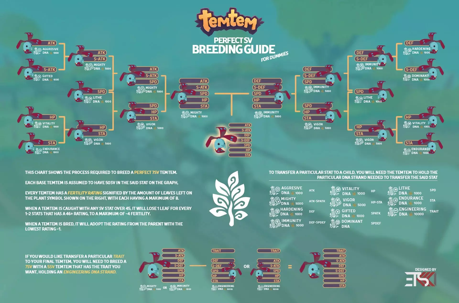如何培育完美腾兽 要让一只新孵化的腾兽拥有全部7项完美个体值(SV),你至少需要7只腾兽,每只各有一项完美个体值(至少有一项SV等于50)。理想情况下,这些腾兽都应具备7点生育率(拥有完美个体值的腾兽所能达到的最大生育率),否则你可能无法完成培育链!每次繁殖尝试都会降低生育率,而且每一代繁殖的腾兽生育率都会持续下降,因此你必须注意不要多次繁殖同一只腾兽(如果你想在整个培育谱系中重复使用某只腾兽,或者后代没有你需要的性别,有时这是必要的)。正因为如此,你最好在第一代就准备7只以上的腾兽,并且让其中一些腾兽的个体值有所重叠。要进行腾兽繁殖,首先你的腾兽需要属于同一属性。如果使用同一物种的腾兽,繁殖速度会快得多,而且后代的性别限制也会更少。 通过给腾兽携带合适的DNA链持有道具(见下方列表),可以传递它们的完美个体值(SV)。这一过程既昂贵又耗时,因为每次繁殖尝试都会消耗DNA链,你需要从繁殖中心购买新的DNA链。开始时,让你的腾兽两两配对,每对各有一个完美个体值——最佳的初始配对是攻击(ATK)与特殊攻击(SPATK)、防御(DEF)与特殊防御(SPDEF)、生命(HP)与耐力(STA),因为这些属性对在第二阶段可以通过单个道具传递。你需要从第一梯队获得4只后代腾兽,因此你需要让这些配对中的一对繁殖两次(或者,为了节省生育率,让两对不同但具有相同个体值的配对进行繁殖),以确保所有个体值都能在后续世代中遗传下去。 这4只后代腾兽每只都应各有两项完美个体值——一只拥有攻击和特殊攻击,一只拥有防御和特殊防御,一只拥有生命和耐力,第四只则与前三者中的某一只拥有相同的个体值组合。为每只腾兽装备能让它们遗传自身两项个体值的DNA链道具(强力DNA、免疫DNA和活力DNA)。接下来,你需要让这4只后代腾兽与一只拥有完美速度个体值的腾兽进行繁殖——同样,在这一步最好使用几只不同的完美速度个体值腾兽,这样它们的总体生育率就不会下降太多。拥有完美速度个体值的腾兽应携带【敏捷DNA链】以传递其速度个体值——你需要使用多个这类道具,因为你可能需要多次繁殖速度腾兽。 在第三阶段,你应该会得到4只各拥有3项完美个体值的腾兽。这4只都应具备完美的速度个体值(这样即使不使用DNA链道具,繁殖这4只的任意组合都能产出拥有完美速度个体值的后代)。由于你的两只三阶腾兽会拥有相同的基础属性,因此要确保为它们搭配具有不同完美个体值的组合。再次强调,使用力量DNA、免疫DNA和活力DNA来传递非速度属性,因为速度属性无论如何都会遗传。 现在你应该有两只腾兽准备好进入四阶阶段——这两只腾兽都将拥有7项属性中的5项完美个体值,并且每只都会有两项完美个体值是另一只所不具备的。给每只腾兽装备一个能让其传递另一只所缺少的那两项个体值的道具——这样就能传递4项完美个体值,而其余3项由于是父母双方共有的,会自然遗传下来。你可能还希望将特定的【特性】遗传给你的腾兽——这可能需要多次尝试和一些运气,或者你可以用【基因工程链】道具替代上述某个培育步骤,以确保遗传特定的【特性】。 如果一切按计划进行,你现在应该拥有完美的腾兽了!