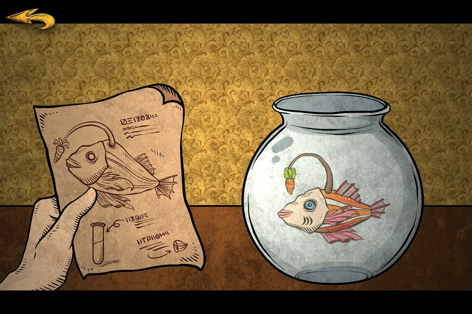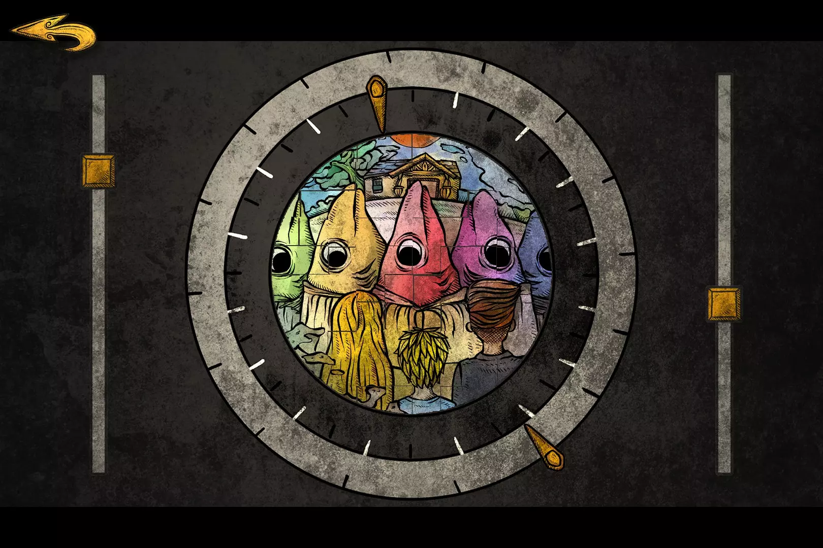 组装完成后,会跳转至混乱的镜头。此时需要调整内外圈以及左右的滑轨,若难以互相对准,可选择某一物体作为首要参照物,例如中间那条红色的鱼就比较明显。拼接完成的图如下: