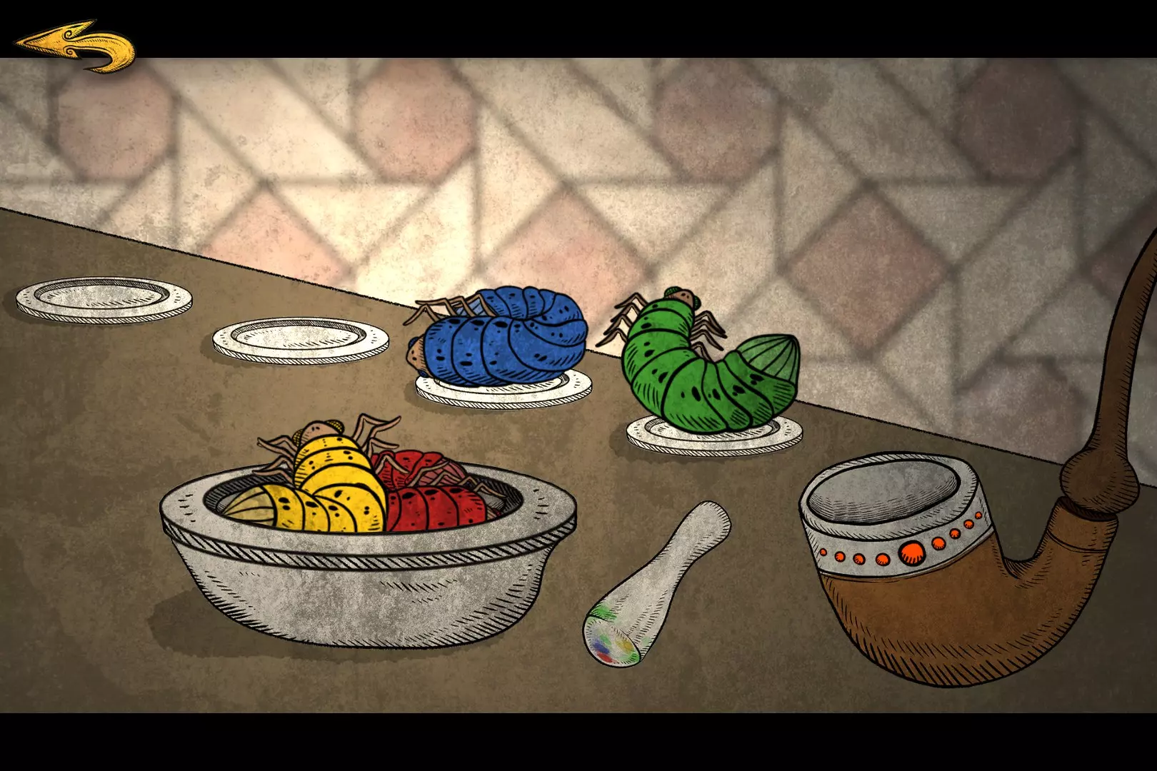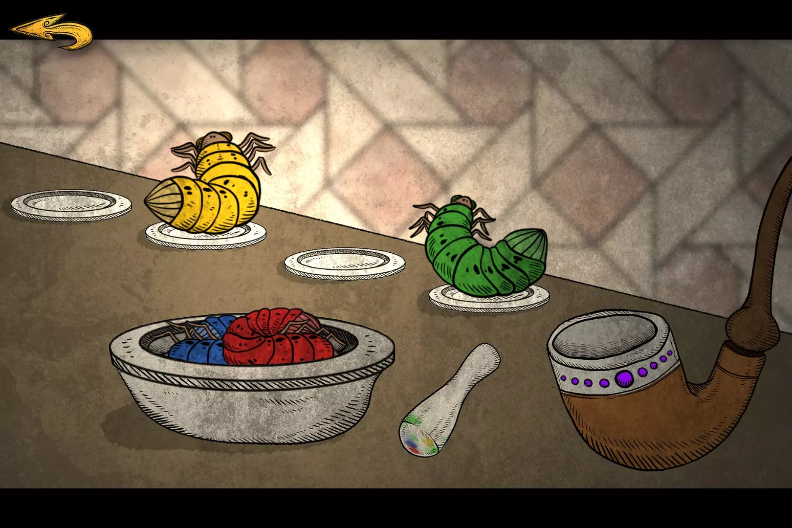 爸爸的习惯 烟斗会显示需要的颜色,将对应颜色的虫子放进石臼,单击石臼右边的杵,然后把捣好的一团放入右边的烟头。有时候对得不够准,会弹回去变回虫子,重复操作即可。 有的颜色需要两种虫子调和出来,如橙色=黄+红: