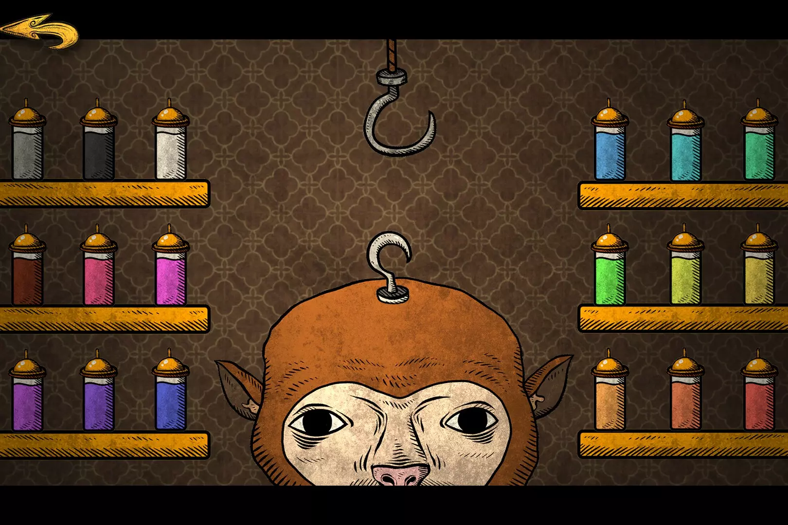 猴脑 点最右上角的瓶子,猴子头顶会出现钩子,然后单击上边的大钩子。
