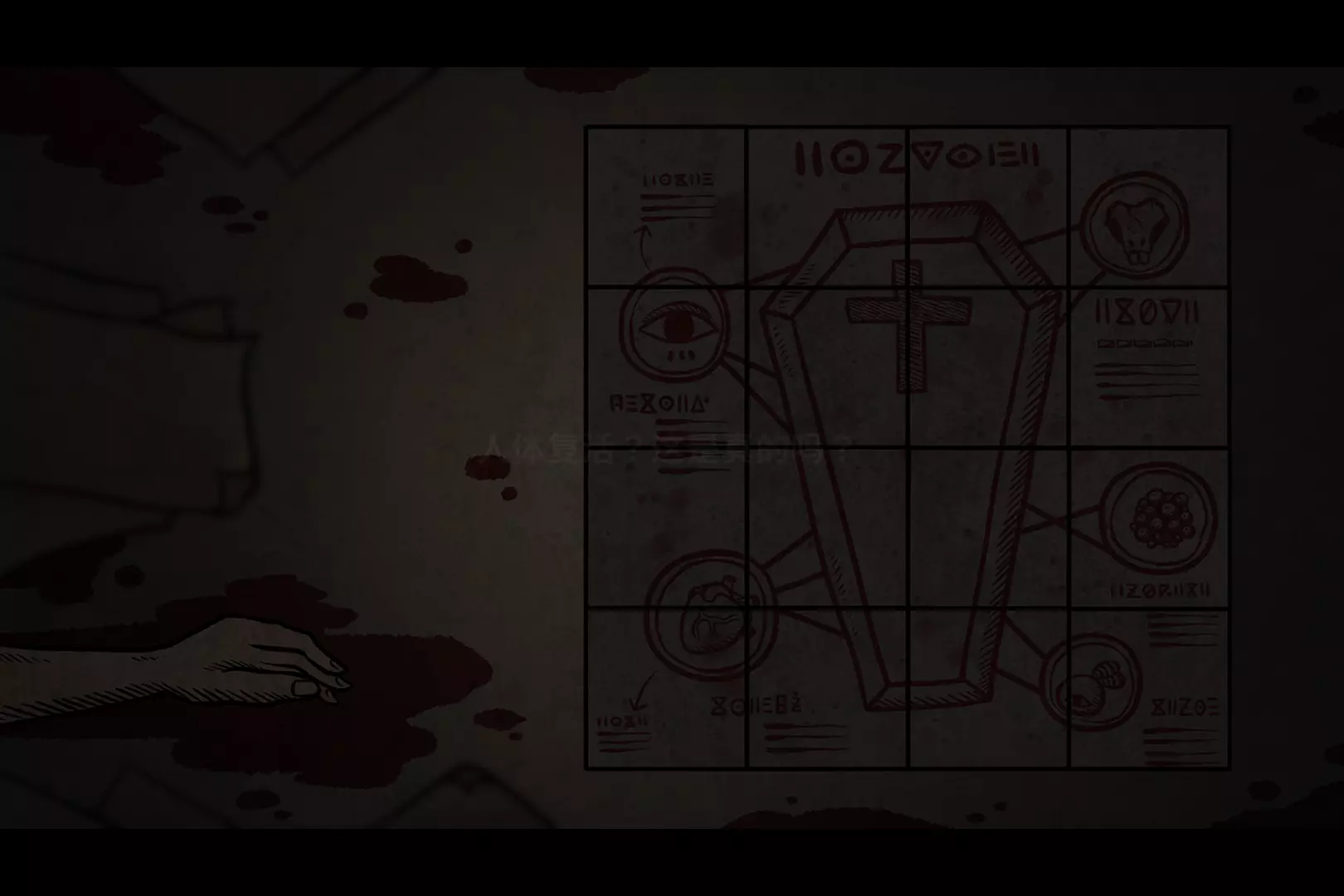 上妆 将掉落的物体放置到对应位置:大脑放入大脑位置,肠子放在脖子下方,眼睛安在眼睛位置,红色物体放在身上会形成红色印记,瞳仁置于瞳仁位置。