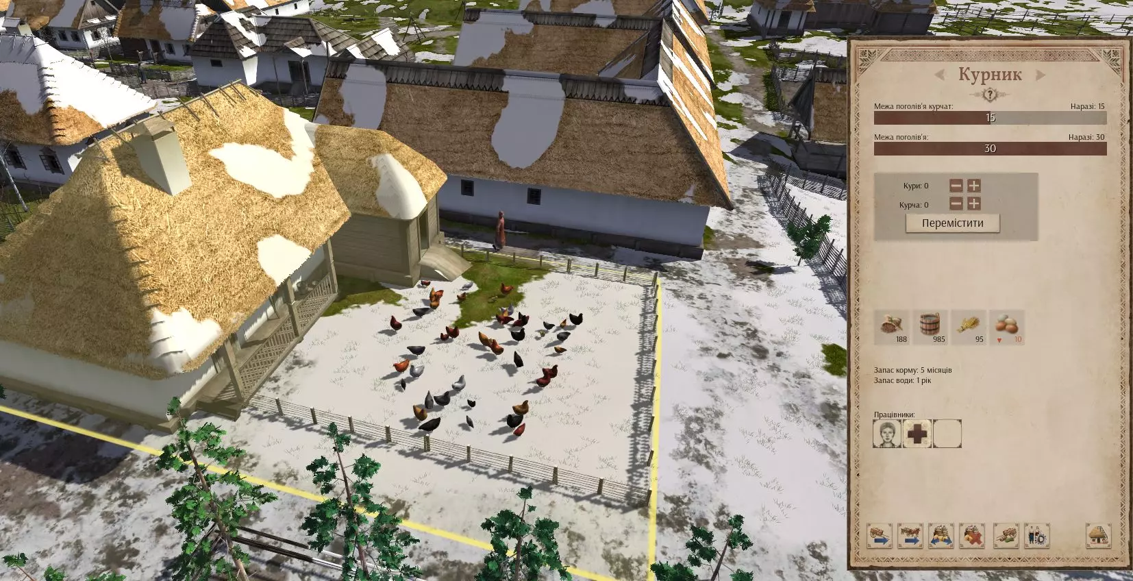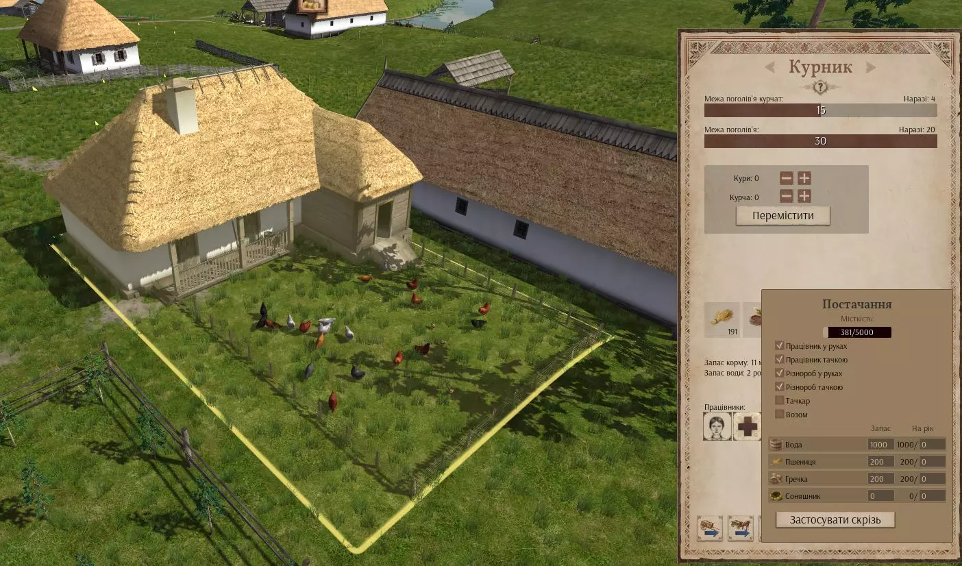 《Ostriv》养鸡的细节。建筑布局、购买、员工。供应、生产力、利润。 购买鸡 只能在梅雷法镇购买。为此,您必须已有贸易仓库,并为其雇佣一名主管和至少一名员工。 到梅雷法的距离为19天。一只母鸡的价格为95格里夫纳。这是游戏中最长且最昂贵的贸易路线。如果信使自行到达您这里,从下单到送达的时间为19天。如果是您派遣信使,等待时间会翻倍——先等信使送达,再等母鸡被送回。 一只母鸡的价格为12货币单位,单次最大购买数量为20只。 建议在母鸡到达前先建造好鸡舍。19天的时间足够您给鸡舍装满谷物和水。而要建造它,只有在满足以下条件时才行:你们必须立即开始动工,并且选址要靠近锯木厂、黏土坑和屋顶材料厂,同时建筑工人不得少于5人。 建议一次性购买20个。这需要240格里夫纳。如果资金不足(在定居点的前2个游戏年,收益通常不太理想),那就选择你们能负担得起的最大数量。数量越多,鸡舍达到满负荷生产的速度就越快。 鸡舍工人