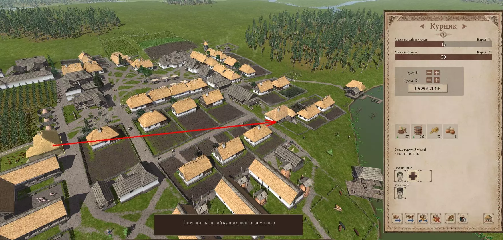当您建造额外的鸡舍后,可以将现有鸡舍中的部分(或全部)家禽转移过去。具体操作是在鸡舍菜单中选择需要转移的数量,设置好后点击【移动】,然后指定目标建筑。第一个空闲的工人会负责将家禽转移到新的鸡舍。 提醒您:务必在动物进入建筑【之前】储备好饲料和水。