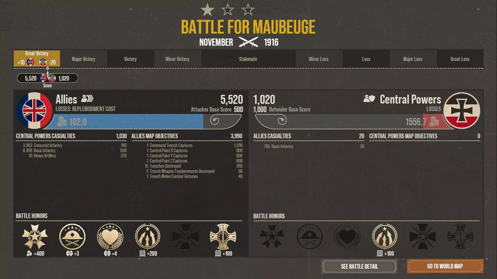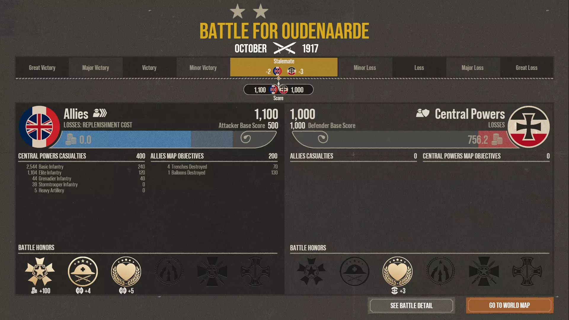 专注于坦克和芥子气,同时保证充足的补给以及基础的其他科技投入。 以最小的自身损失击败AI,并且在进攻和防御中同样有效。 从侧翼包抄到火力压制敌人的各种战术都能运用。 科技 研究: - 一级战斗机(纯粹用于防御轰炸机) - 补给升至二级 - 黄金升至二级 - 坦克 - 芥子气 其余科技为可选,建议略微提升步兵武器。 进攻 - 有或无坦克的侧翼包抄 选择最有利的侧翼。 对于步兵而言,是森林覆盖最多的侧翼。对于坦克而言,是敌方胜利点最少的侧翼。 部署最少数量的防御单位守住己方目标,将其余部队部署在进攻侧翼。手动将两支步兵部队分别部署去占领一条战壕。 让坦克迅速推进至地图边缘,以避开敌方火炮的射击角度。 用轻型火炮进行掩护攻击,以压制敌方防御。 一旦攻克一侧侧翼,就沿着敌方火炮射程之外包抄其防线。 进攻 - 芥子气消耗战 通过部署足够的飞机、步兵、坦克以及二级补给站,确保拥有充足的本地补给。 配备4门具备芥子气技术的重型火炮和1个观测气球。 现在只需用芥子气逐步摧毁敌方战壕。 有时甚至可以零伤亡赢得战斗。