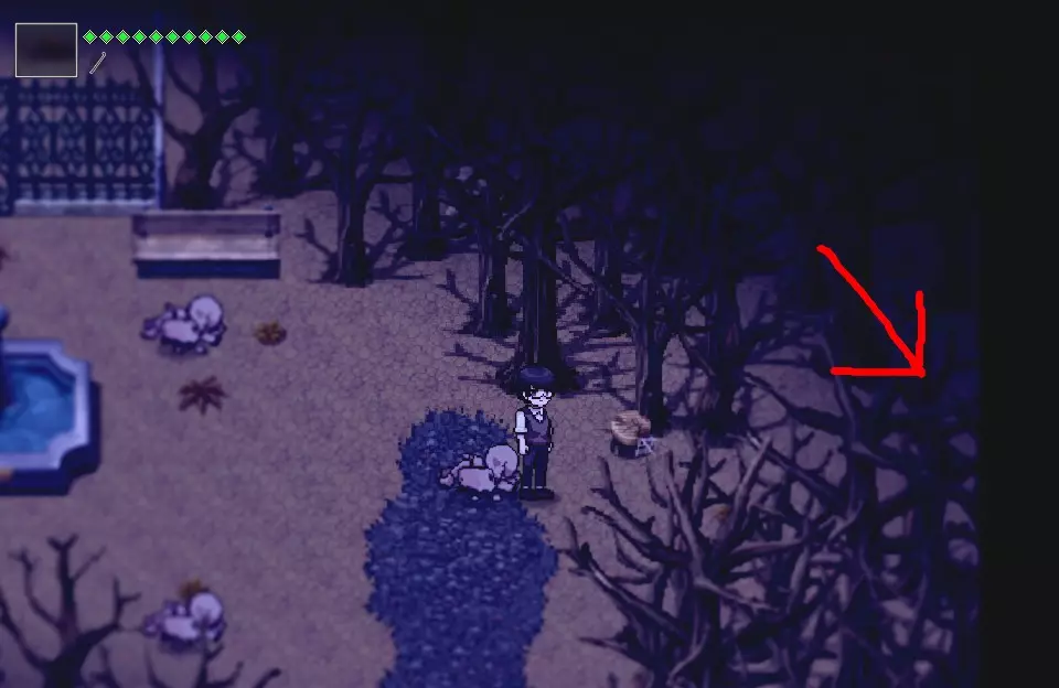 干得好! 获取贴纸 再次前往同一个喷泉的左侧,直到抵达该区域。穿过树林向下走。