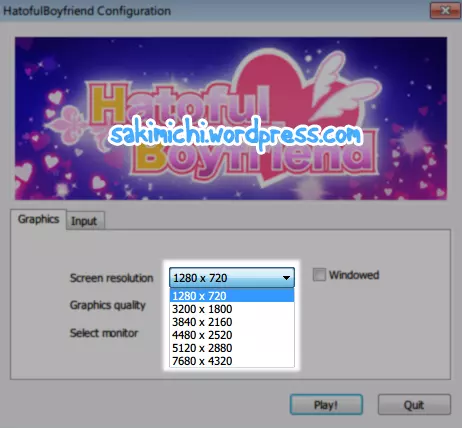在Steam中运行《 Hatoful Boyfriend》,你应该会看到新的屏幕分辨率选项。我选择了3200×1800,并且取消勾选窗口复选框,然后点击“Play!”。