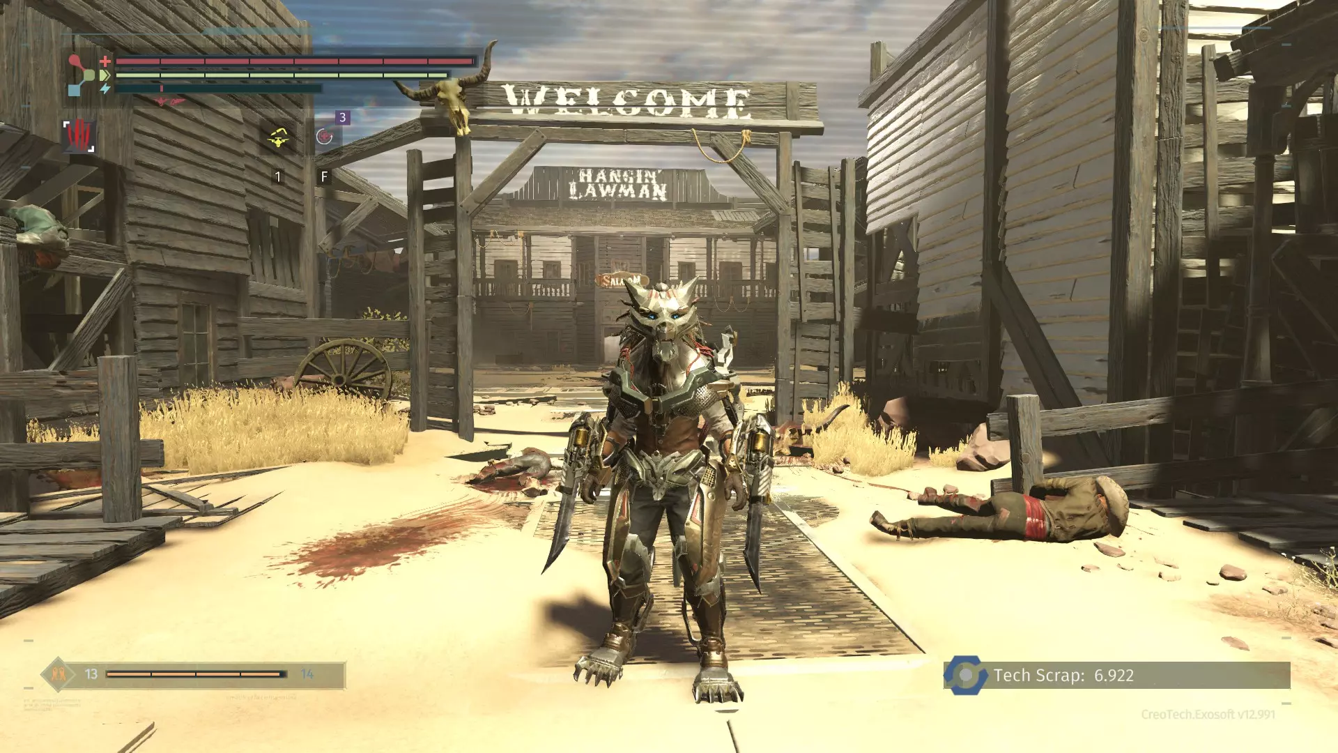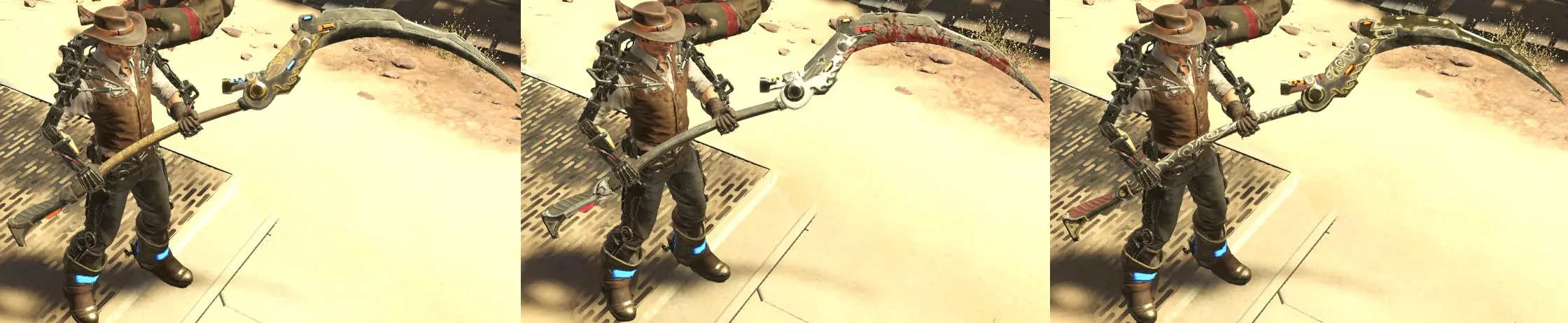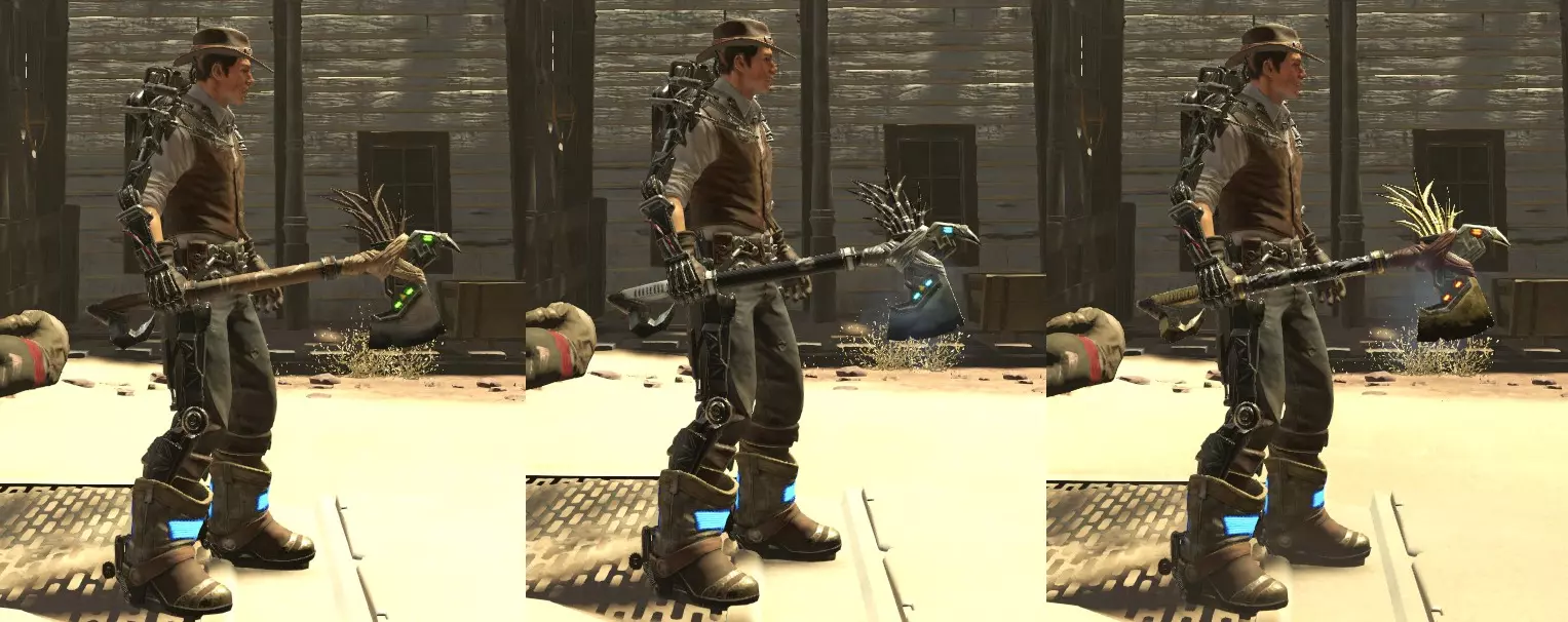 获取所有边境装备套装 现在情况变得有些棘手。这个DLC中的3套装备各有两个版本。普通版本(边境)可从任何普通敌人身上掉落(在更高章节中更常见),稀有版本(V2)仅从 bosses 身上掉落。boss会装备哪件稀有装备是随机的,且取决于你激活了多少挑战 modifier。在设置章节时,留意激活的 modifier 框,以获得最高的掉落几率。不同版本之间的外观差异可能很细微,你需要在决定要肢解哪个部位之前仔细观察 boss。要解锁此成就,你需要收集所有套装的设计图,并制作出每个套装的两种版本,共计六套完整装备。由于每次游玩时击败 Boss 只能随机获得一张设计图,因此这可能需要一定的刷取时间。记得使用游戏内的修改器!如果你想了解各套装的加成效果,我也已列出。以下是展示外观差异的截图: 【精神动物(哨兵)】—— 可从普通敌人和图腾狼的标准装备中掉落 (每次击中敌人时获得伤害加成,但每次受到攻击时会降低自身伤害)