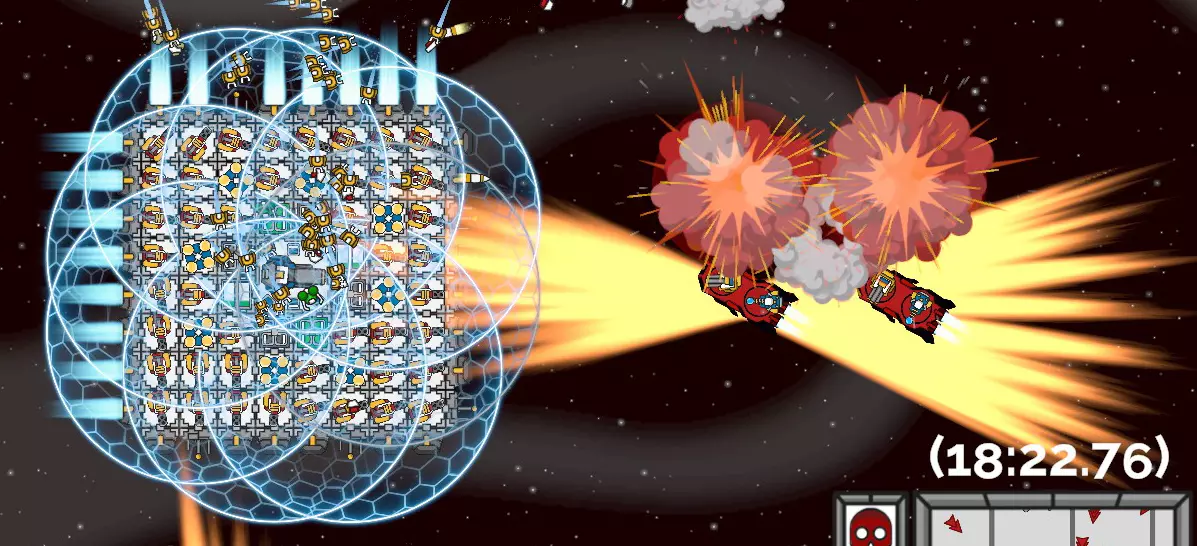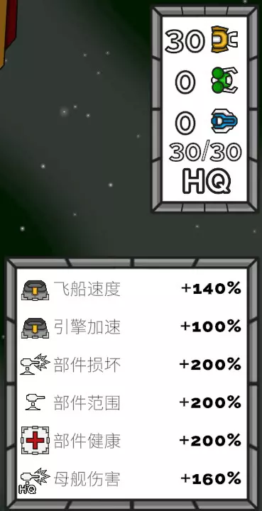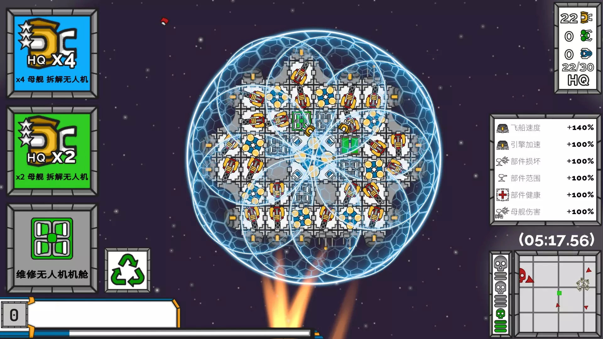 成就:6分钟通关 (Crazy Commander) 1. 火焰喷射器+护盾发生器+拆解无人机,(维修无人机和引擎可有可无) 1)火焰喷射器的输出最佳,穿透敌人并且无视敌人的护盾。 2)护盾发生器是必备,需要安装8个部件,母舰上也安装护盾发生器,可以包围整个母舰。 3)拆解无人机让你尽快升级。先装4个部件,然后母舰上尽量装满30个。