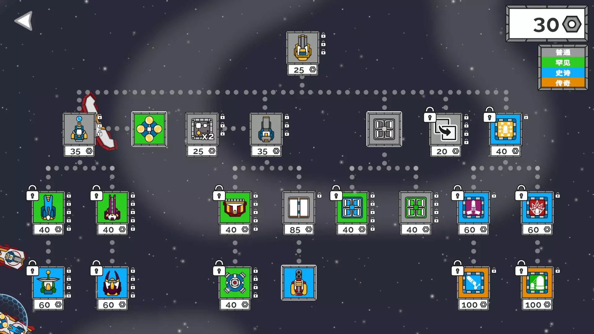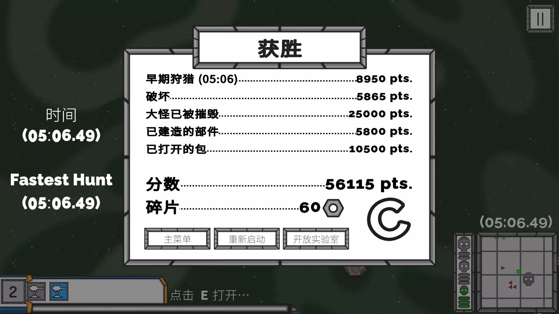 3. 游戏开始,只打陨石群升级部件,初期不打巡逻敌人和敌方基地。 4. 边打陨石边升级,慢慢接近BOSS,直到05:20开始与BOSS开战,需在40秒内击败BOSS。 5. 达成【成就】并不难,重点是不要在实验室升级多余的部件。