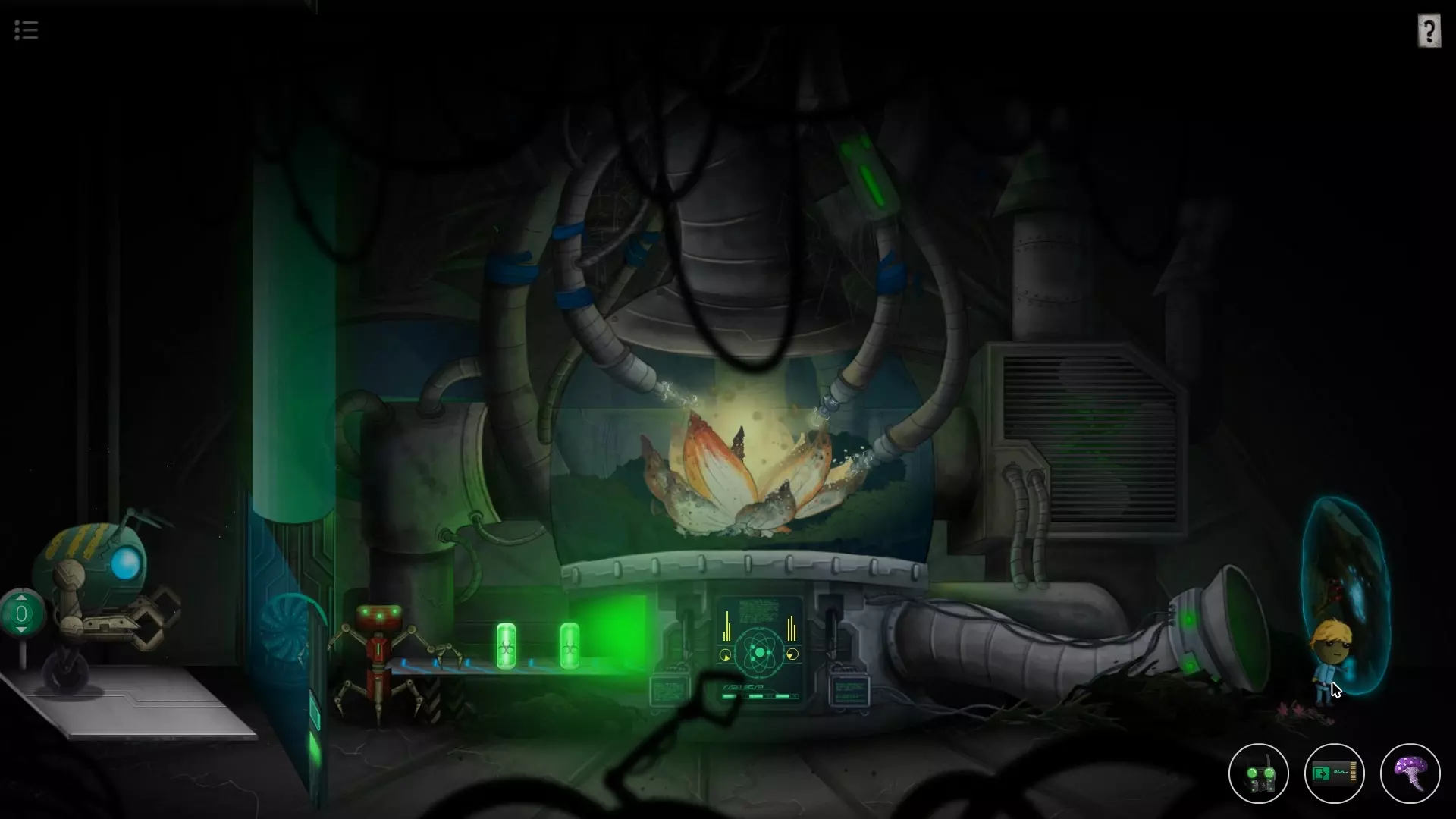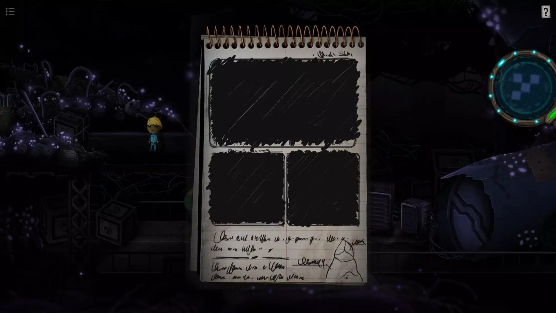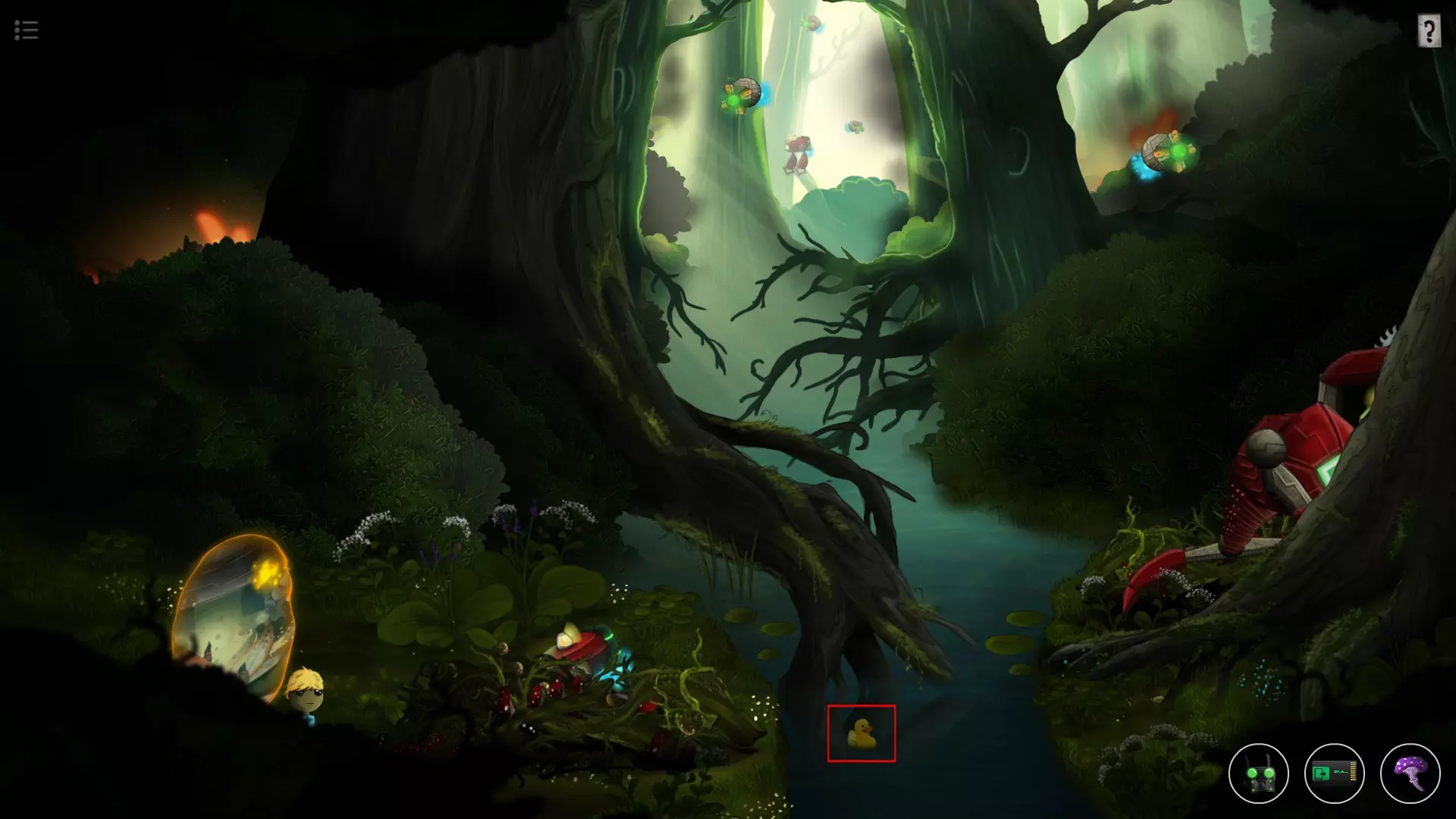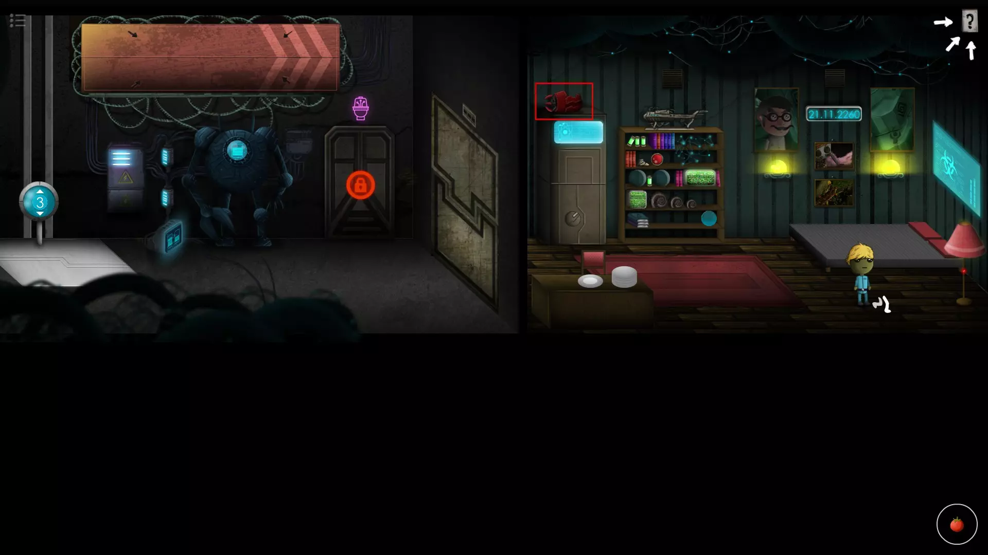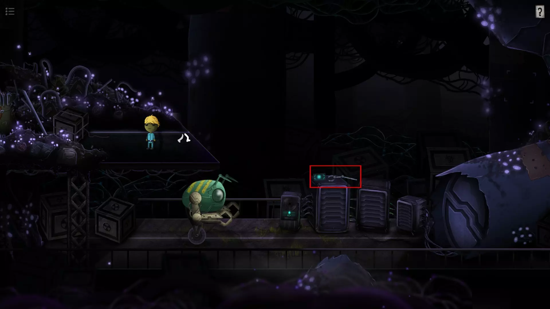 收集品5(第10关) 左上角高台上有一个小机器人,点击它会让你解一个九宫格的谜题,它的提示信息藏得非常隐蔽(右上角的【问号提示】中的放大镜可以移到书的外面)