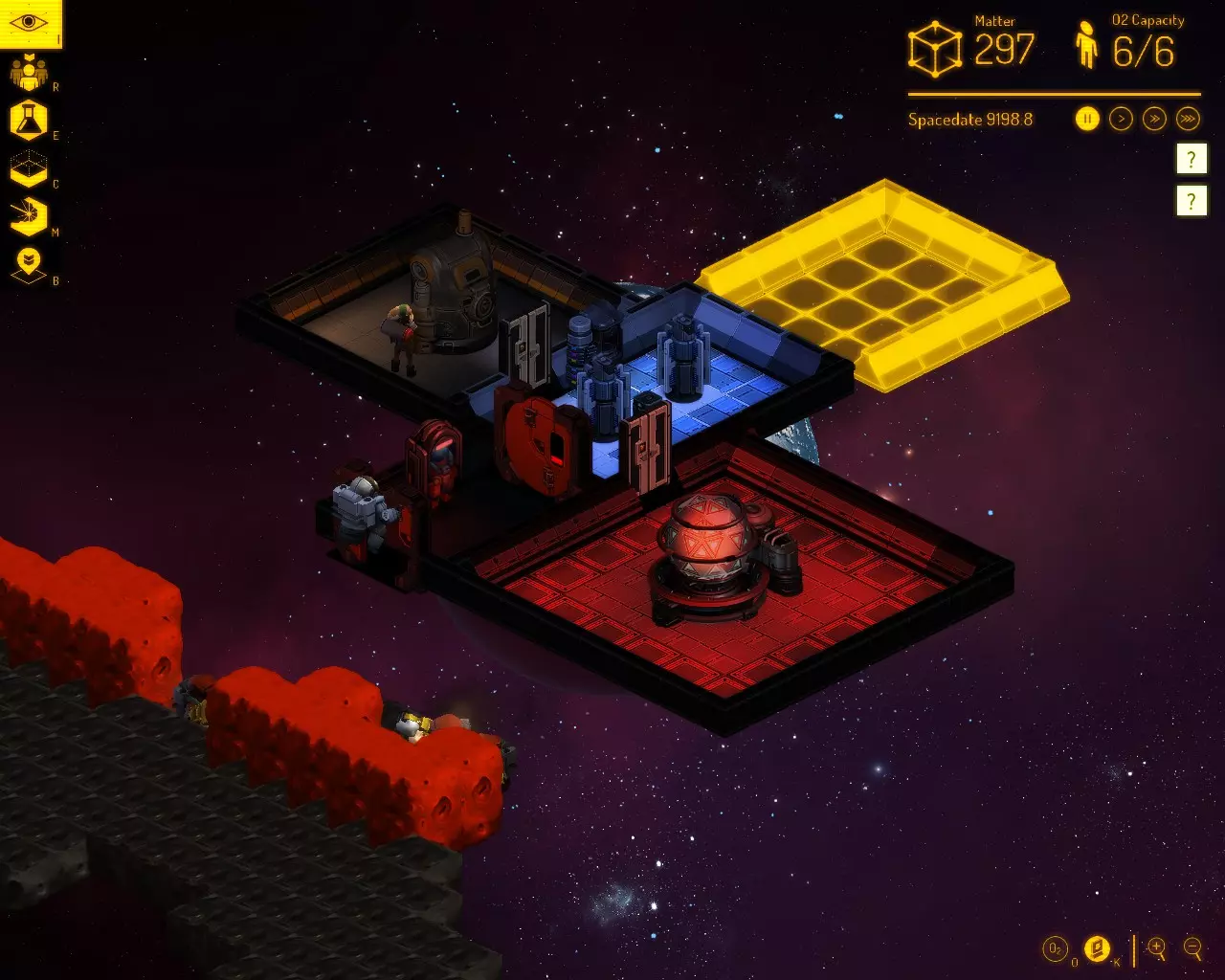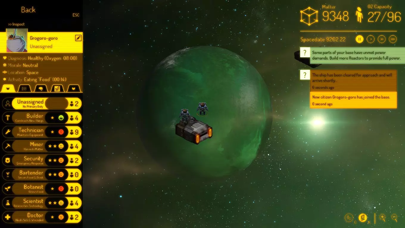 现在你也不再需要矿工了。跃迁进来的敌方飞船很可能拥有足够的可破坏物质,为你的基地永久供能。 使用你自己或敌方的气闸控制装置,将所有敌对目标驱逐出去。 新更新提示: 现在,如果没有安保措施,太空站的运营似乎会变得更困难一些,因为 Raiders 也会出现在你的气闸处。 你可以通过让气闸通向一个带有太空出口门的房间(就在它们进入你的基地之前)来抵消这种新能力。 当入侵者进入时,只需锁上通往基地的门,打开通往太空的门,就能将他们永远弹射出去。