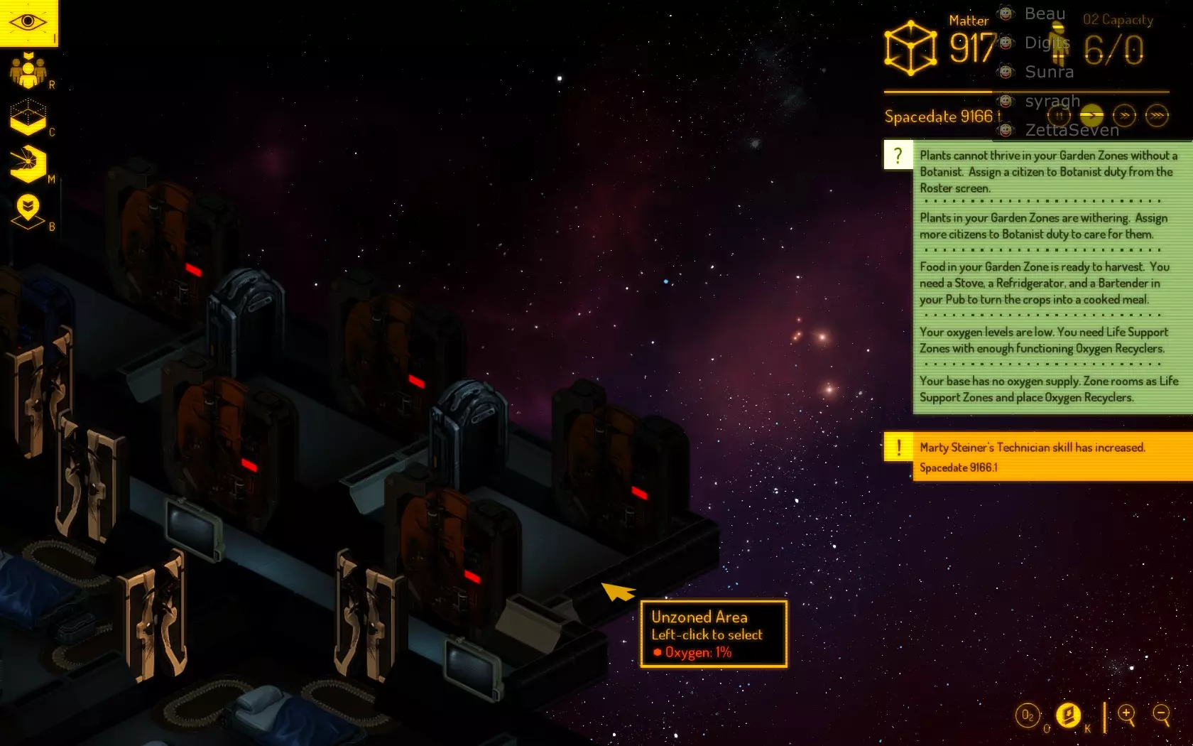 如何消灭所有想要摧毁你基地的敌人。 把他们打成马蜂窝。 建造者的最高优先级是拆除墙壁。在他们的气闸上打洞,防止你的船员试图维修他们的空气循环器;在他们的墙壁上打洞,让里面的所有人都被吸进太空。 额外提示 如果出于某种原因,你的船员进入了敌方飞船的气闸,请暂停游戏,点击气闸并将其区域设置改为【未分区】。这将阻止你的船员使用那个气闸。