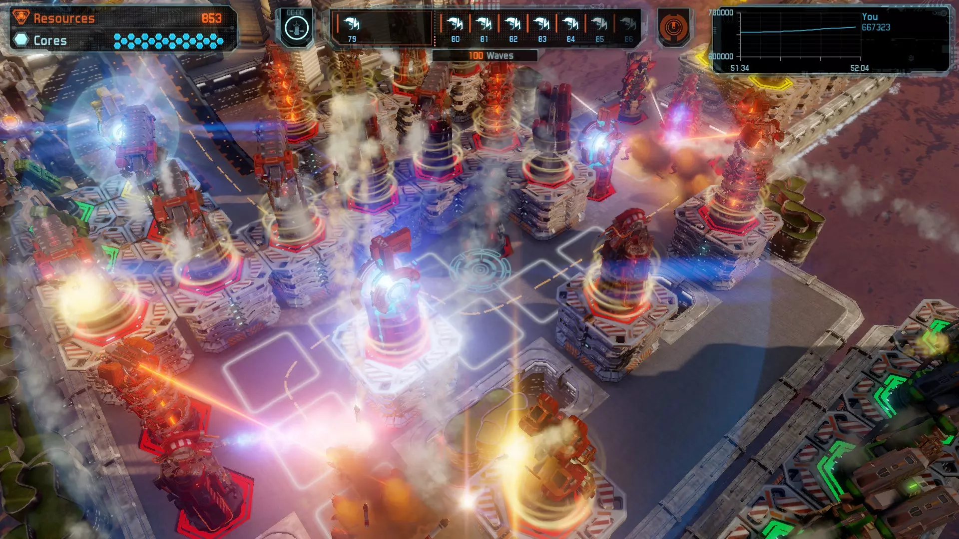 新评分系统详情: 从设计理念上来说,我们希望评分能够同时反映玩家的效率以及保护核心的能力。高分应当属于那些能保全所有核心且消耗资源最少的玩家。 我们曾采用利息机制(资源按固定速率转化为分数)作为效率的衡量标准,但发现这种方式存在一些缺陷——评分过于侧重效率,而对保护核心的权重不足(在游戏接近尾声时,让外星人逃脱反而更有利)。此外,这还导致玩家倾向于尽可能延长游戏时间以获取更多分数,并在关卡结束时对防御塔的出售进行微操。作为回应,我们对计分系统进行了多项重大调整: 1. 分数不再基于时间计算。 2. 击杀外星单位时,你将获得该单位对应的基础分数,以及基于以下因素的奖励分数:你的资源价值、已放置防御塔的出售价值(效率)和你保住的核心数量(防御成功度)。 3. 游戏最后一波时资源不再持续增长,但你会在之前一波结束时获得大量资源奖励,用于最后一波的部署。 调整后带来的影响: 1. 未击杀外星单位会导致分数远低于击杀该单位的情况,你将错失一次得分机会。 2. 出售防御塔不会对分数产生任何影响。建造新塔会略微降低你的效率(降低幅度为塔成本的25%) 保住核心非常重要。核心既会直接影响你的分数(你会失去因外星人逃脱而本应获得的分数),也会在后续产生影响(所有后续奖励都会减少) “拉扯”仍然是一种可行的策略,但现在只有在击杀相同数量的外星人所需的塔更少时才适用,而不仅仅是为了延长外星人在地图上的时间 试试看,让我们知道你的想法。 非常感谢你一直以来的支持! 外星人来袭!
