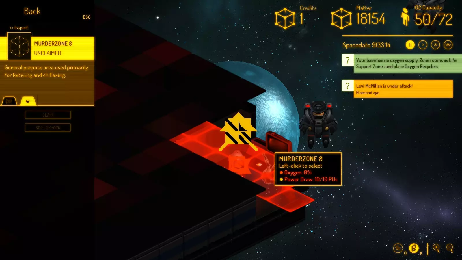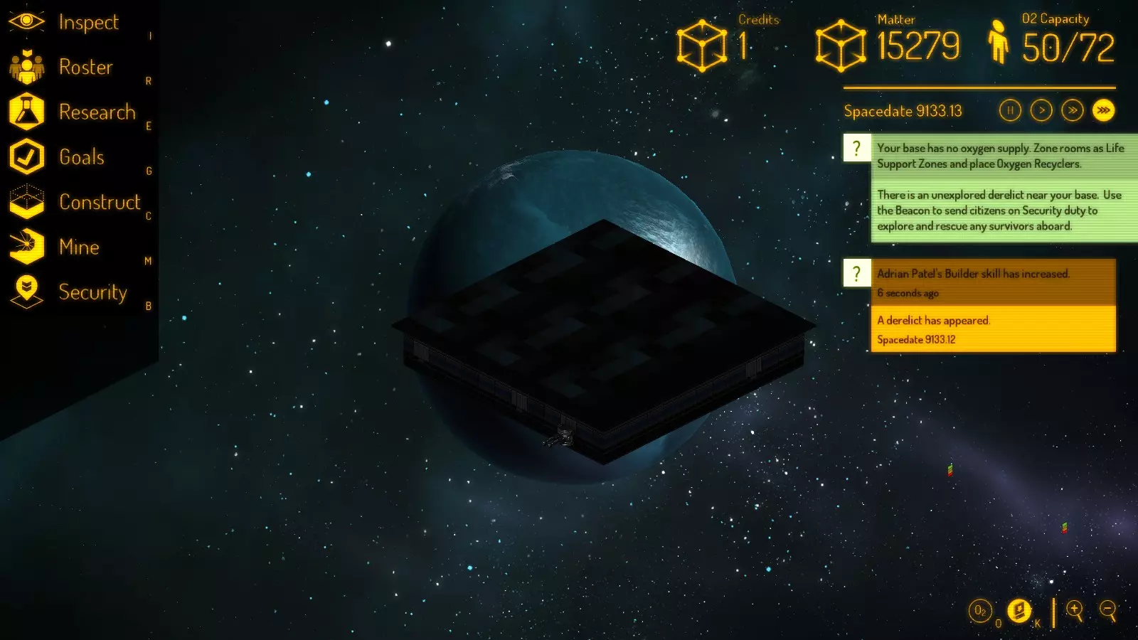 它们通过以下因素提供各种游戏情境: 恒星密度:可开采成物质的小行星数量; 星门距离:新人员与你接触(并可能尝试加入你)的频率; 威胁系数:掠夺者前来捣乱的频率; 磁干扰:废弃船只出现的频率,包括废弃的小行星块。 我偏好40-17区域,该区域的恒星密度和磁干扰较高,威胁系数较低,星门距离较近。这算是一种轻松惬意的体验,哈哈。 总之,选择一个你喜欢的区域开始游戏吧!另外,进入地图后别忘了按K键——隐藏墙壁的完整高度——这很有帮助。 建造太空基地1 你从种子舱和3名随机人员开始。8分钟的氧气量足够建立一个基地。